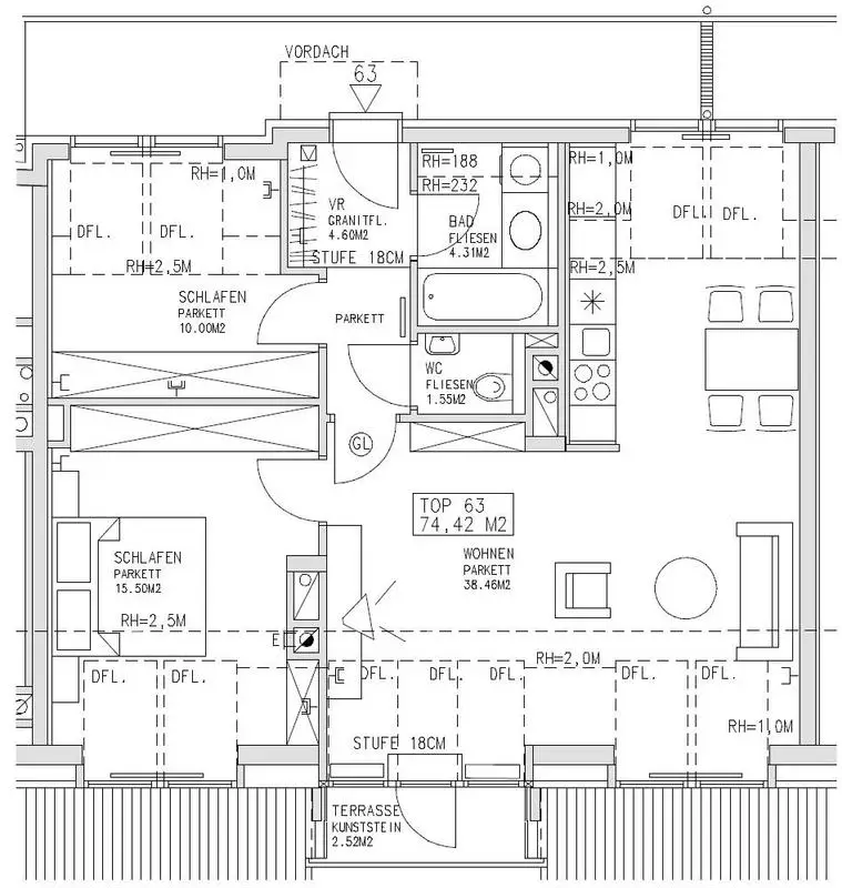 Vorraum, Küche, 3 Zimmer, Bad, separates WC