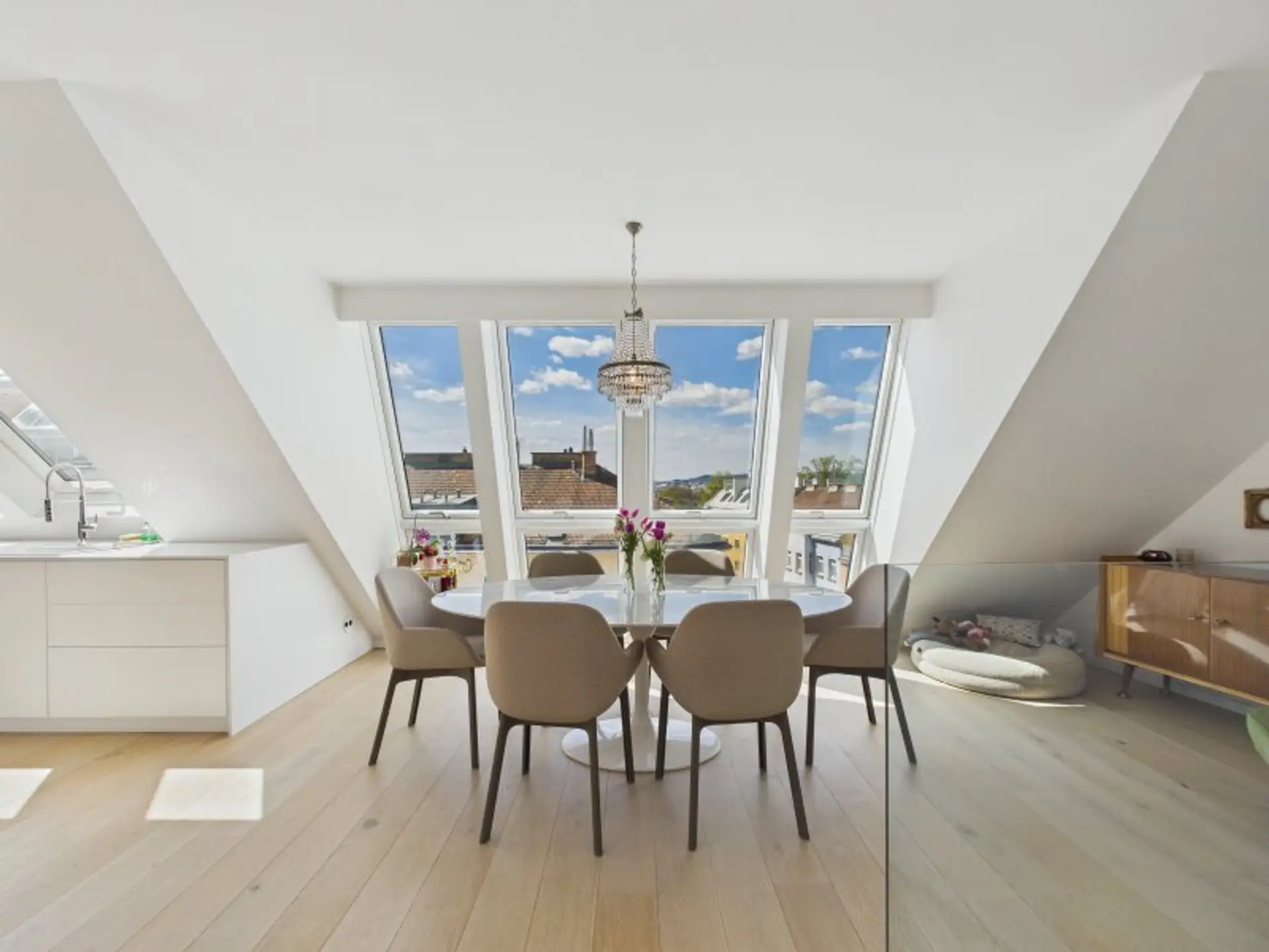 Das Herzstück der Wohnung befindet sich in der mittleren Ebene: Ein offener, lichtdurchfluteter Wohn- und Küchenbereich mit direktem Zugang zu einer Terrasse. Große Fensterfronten und die offene Galerieebene sorgen hier für ein besonderes Ambiente. Die untere Ebene dient als privater Rückzugsort mit mehreren Schlafzimmern und Bädern, während die oberste Ebene ausschließlich der privaten Dachterrasse gewidmet ist, die einen Ausblick über Wien bietet.
