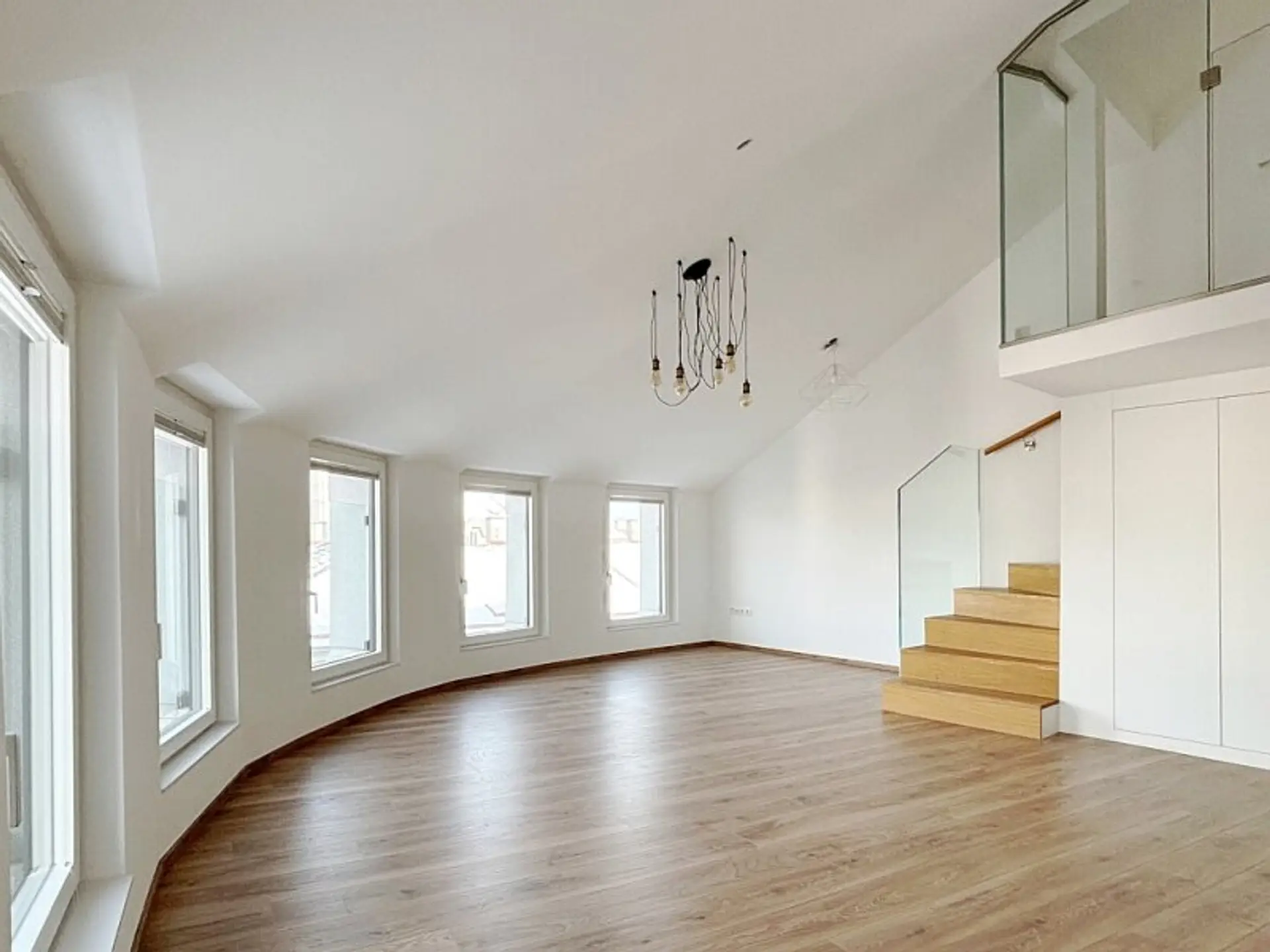 Über die Stiege gelangt man auf die Galerie und über einen Gangbereich mit raumhohen Schränken weiter zum zweiten Schlafzimmer mit einem kleinen Balkon sowie dem zweiten Bad mit Dusche, Waschtisch und WC. Über eine Wendeltreppe gelangt man auf die Dachterrasse.