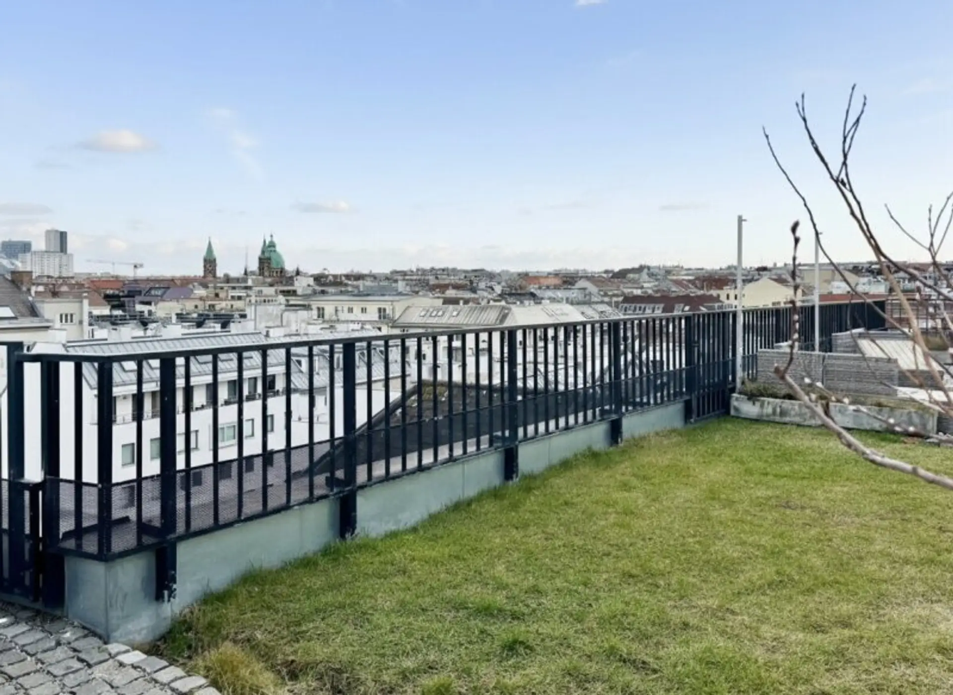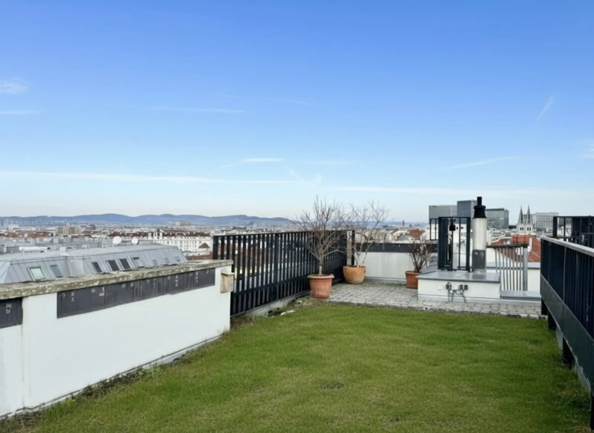 Auf der ca. 31 m2 großen Dachterrasse genießt man einen atemberaubenden Ausblick über Wien. Bei guter Fernsicht sind die Hügel des Wienerwaldes sowie der Kahlenberg und Bisamberg und das Leithagebirge zu sehen. Wasseranschluss sowie mehrere Steckdosen und Beleuchtung lassen eine vielfältige Nutzung zu.