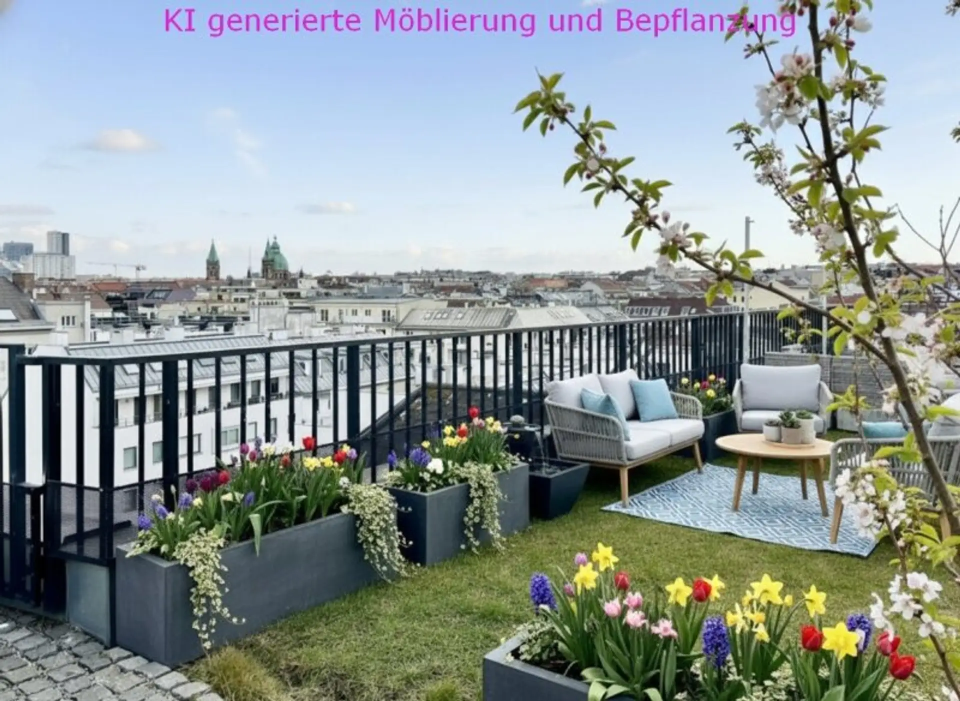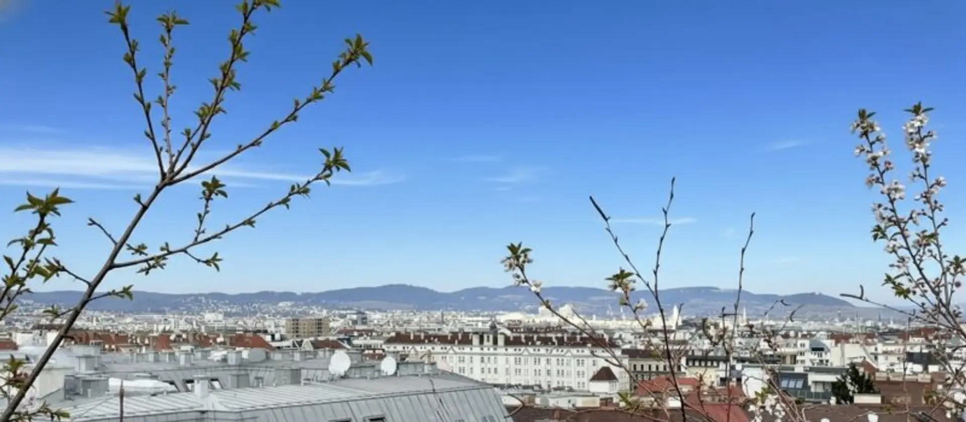 Auf der ca. 31 m2 großen Dachterrasse genießt man einen atemberaubenden Ausblick über Wien. Bei guter Fernsicht sind die Hügel des Wienerwaldes sowie der Kahlenberg und Bisamberg und das Leithagebirge zu sehen. Wasseranschluss sowie mehrere Steckdosen und Beleuchtung lassen eine vielfältige Nutzung zu.