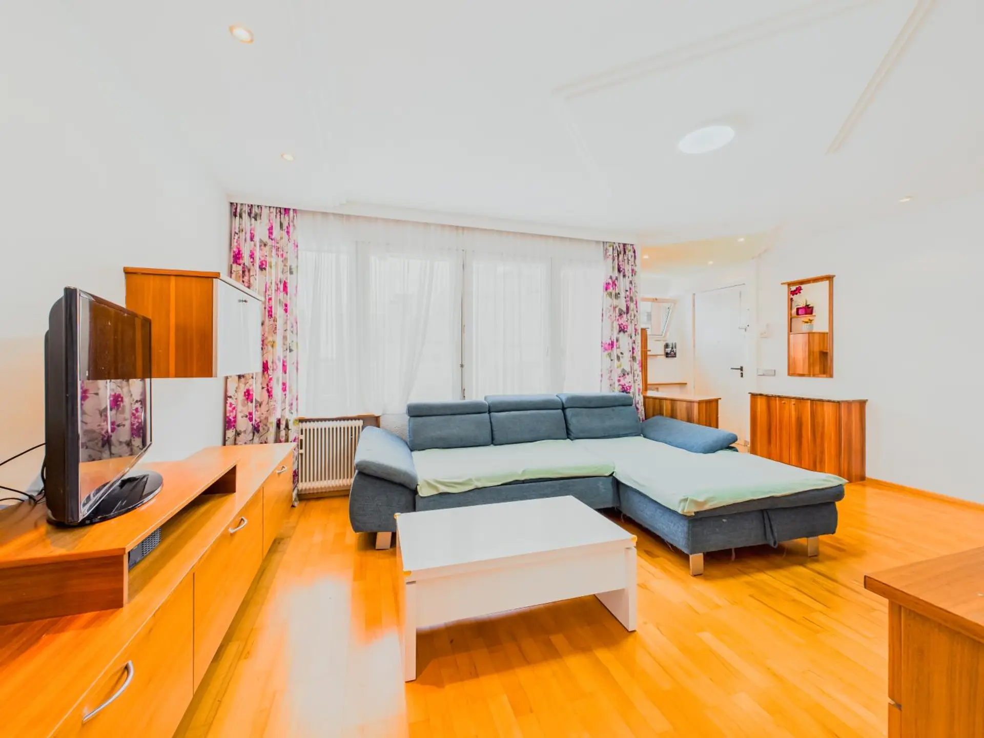 Der Grundriss bietet ein weitläufiges Wohnzimmer, einen separaten Küchenbereich, zwei gut geschnittene Schlafzimmer, ein gepflegtes Badezimmer mit Badewanne und Dusche sowie ein separates WC. Die Räume sind angenehm dimensioniert und schaffen ein Wohnambiente, das sowohl Familien als auch Paaren viel Platz und Flexibilität bietet.