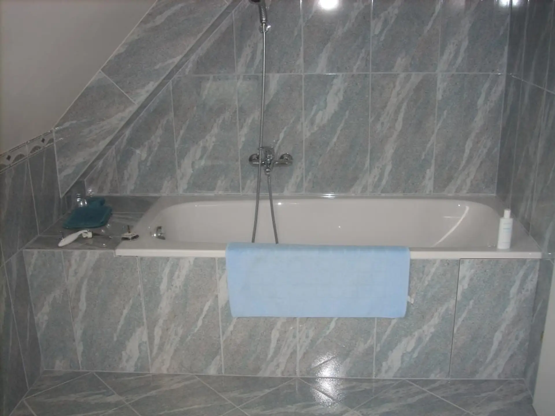 Zweite Ebene: Gang, Schlafzimmer mit Bad (Wannenbad), kleines Büro, zwei Terrassen (O/W).