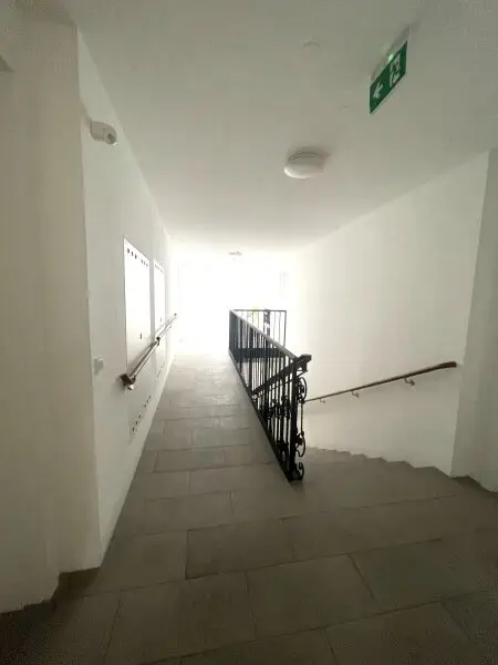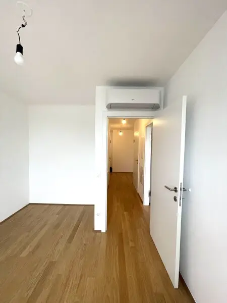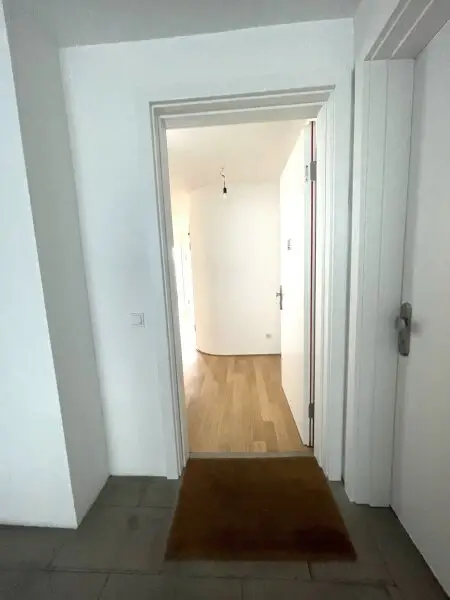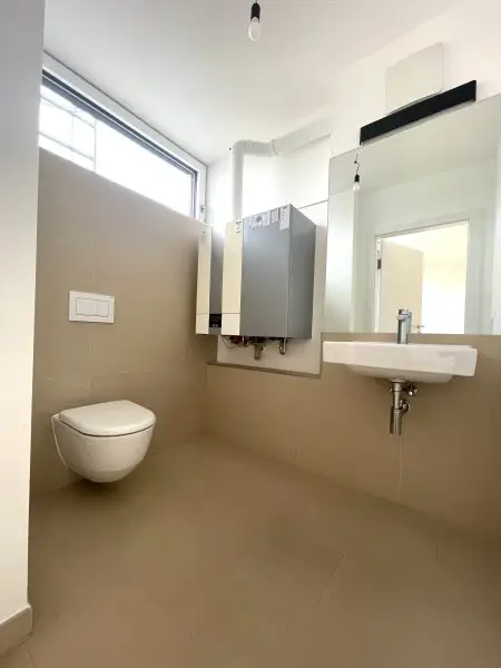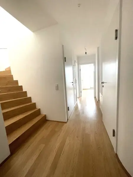 Vom Vorraum aus sind alle Räume zentral begehbar. Rechterhand befindet sich das Badezimmer, gerade aus zwei Schlafzimmer mit Zugang zur 1. Terrasse (Nordseite). Das großügige Badezimmer ist mit einer Badewanne sowie Handtuchwärmer und Waschbecken bestens ausgestattet. Das WC ist separat begehbar. Linkerhand des Vorzimmers gelangt man über eine Treppe in die 2. Etage.