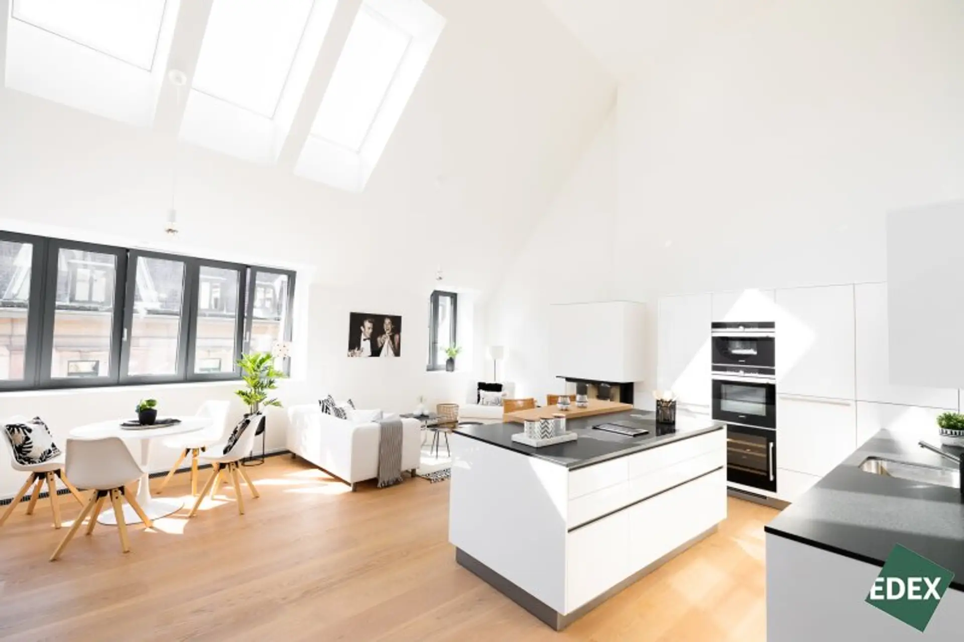 Covering ca. 180 m² and over two floors one finds this gorgeous apartment in a class of its own. The 4 rooms are very generously applied and enable an open and formidable living-experience. The flat includes a loft-like kitchen-cum-living room with the height of the room being more than 5 meters. The gallery floor covers a separate master bedroom. A guest room and a children’s room are located on the lower level.