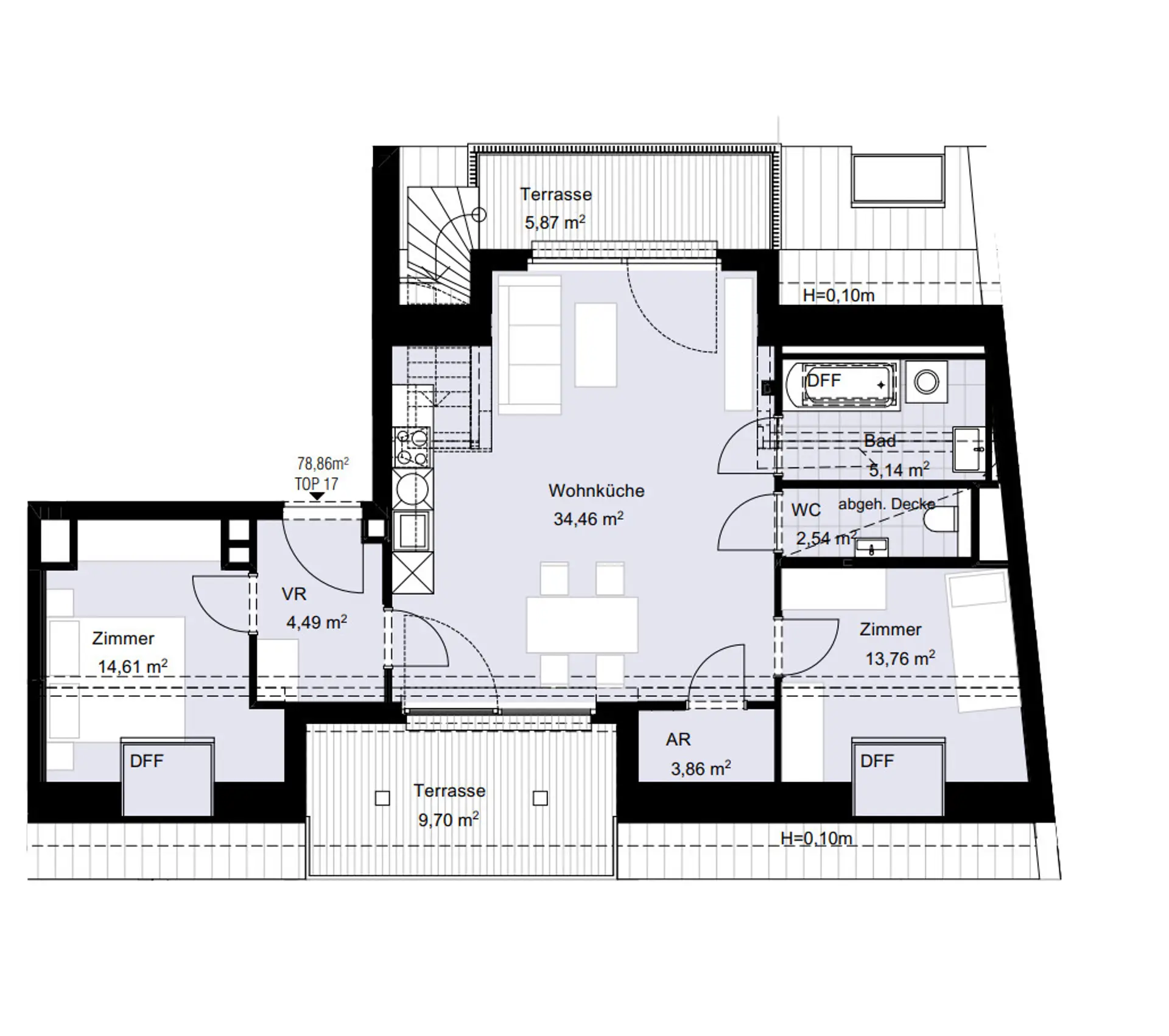 Ein moderner & weitläufiger Küchen- und Essbereich lässt keine Wünsche offen. Von hier aus genießen Sie den Ausblick und erreichen sowohl die südseitige Terrasse mit 10 m² Fläche, als auch die ruhige Innenhofterrasse mit Aufgang zur 25 m² großen Dachterrasse. Die Dachterrasse besticht mit ihrem einzigartigen 360-Grad-Blick über ganz Wien und Umgebung. Der Blick reicht vom Kahlenberg zum Rathaus über die Millenium City bis hin zum Donauturm und dem DC Tower: Hier kann man von früh bis spät die Sonne genießen!