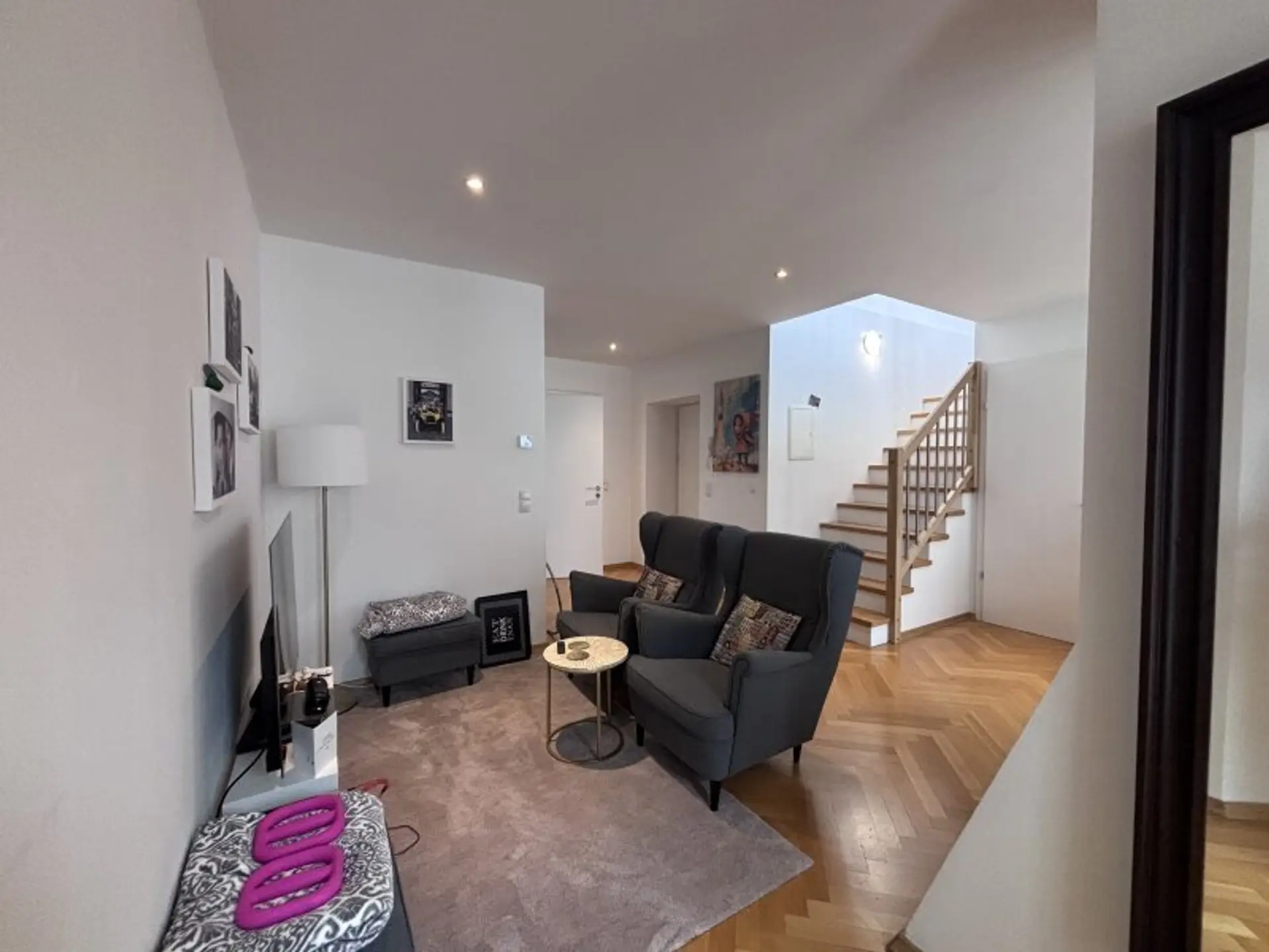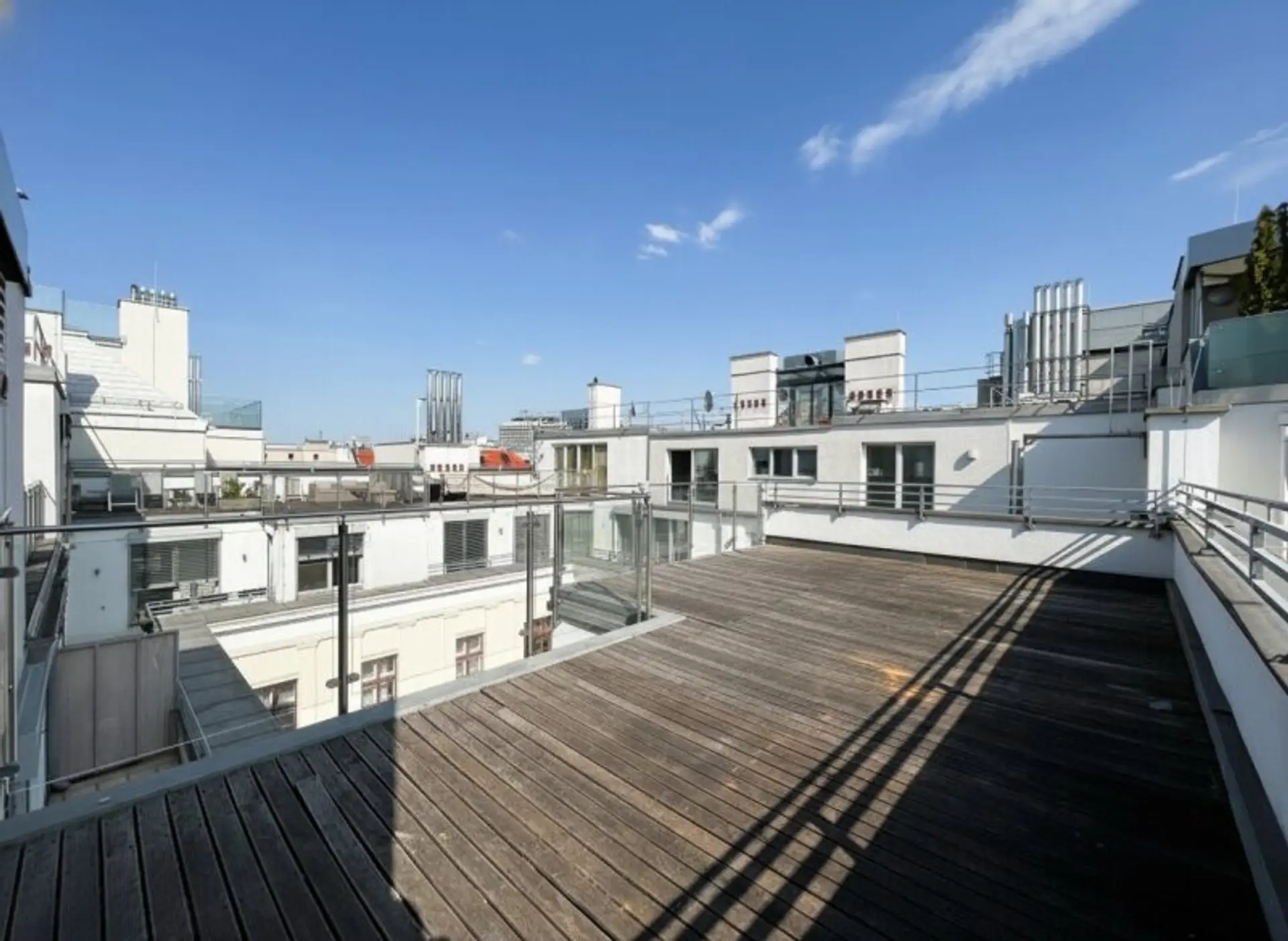 Eine interne Treppe führt in den großzügigen Wohnbereich der oberen Ebene, der über ein weiteres Duschbad mit WC verfügt und direkt auf die große, ca. 26 m² umfassende Dachterrasse führt.