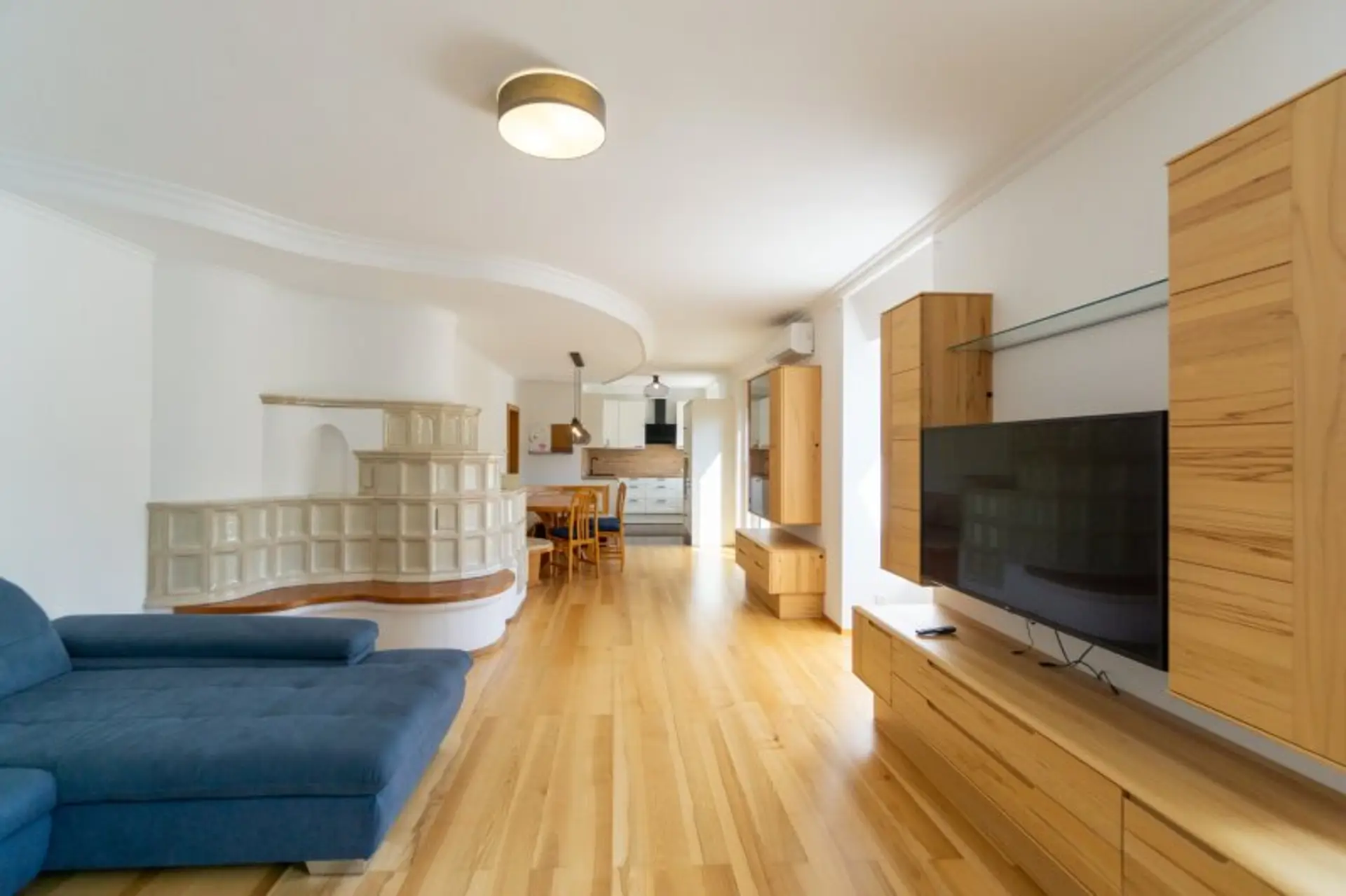 Der helle Wohn-Essbereich überzeugt durch offene Raumgestaltung und zahlreiche Dachfenster. Ein Kachelofen, der von der Garderobe aus beheizt wird, sorgt für wohlige Wärme. Die hochwertige DAN-Küche ist mit Markengeräten ausgestattet. Vom Wohnraum aus gelangt man direkt auf die ruhige Terrasse mit Wasseranschluss, Steckdose und elektrischer Markise.