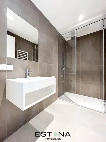 - Badezimmer mit Dusche, Waschbecken und Waschmaschinenanschluss