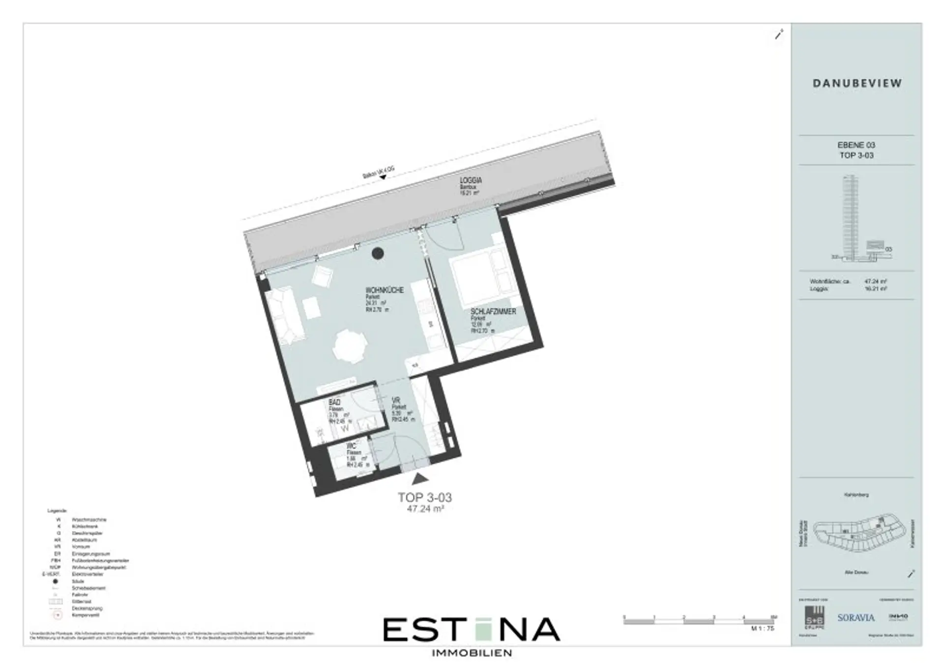 DANUBEVIEW bietet insgesamt 159 Mietwohnungen mit Flächen von 30 m² bis 150 m² und 1 bis 4 Zimmer. Die Grundrisse der Wohnungen gestalten sich offen und lichtdurchflutet. Mit großzügigen Fensterfronten schaffen diese ein freies Raumgefühl mit herrlichem Ausblick auf die Neue Donau und die Wiener Innenstadt. Durchdachte Außenplätze mit einem ansprechenden Landschaftsdesign verbinden sich zum persönliche "art of living" Lebensmittelpunkt. Zusätzlich lassen sich private Arbeitsplätze im Haus anmieten.