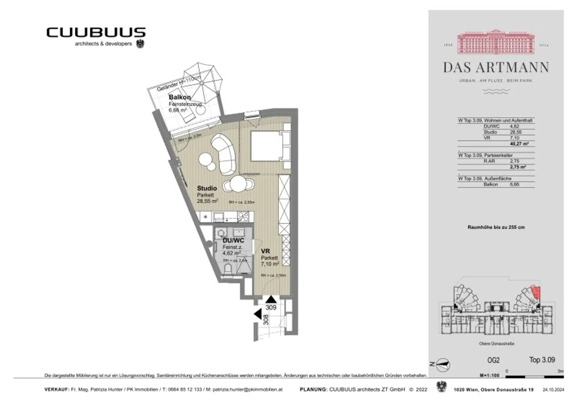 The apartment is equipped with a modern kitchen and also has a modern bathroom with shower. Full furnishing is also possible by separate agreement. Underfloor heating, cooling in the form of fan coils, and controlled ventilation guarantee maximum living comfort.