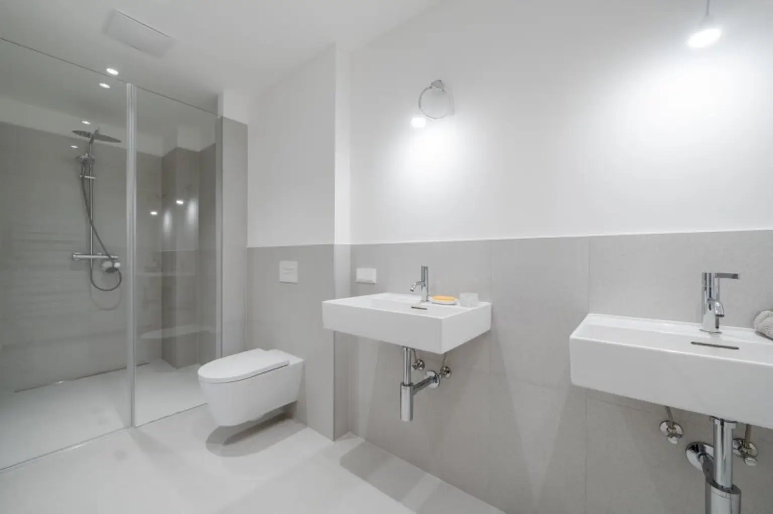 * hochwertiges Feinsteinzeug und Sanitärausstattung
