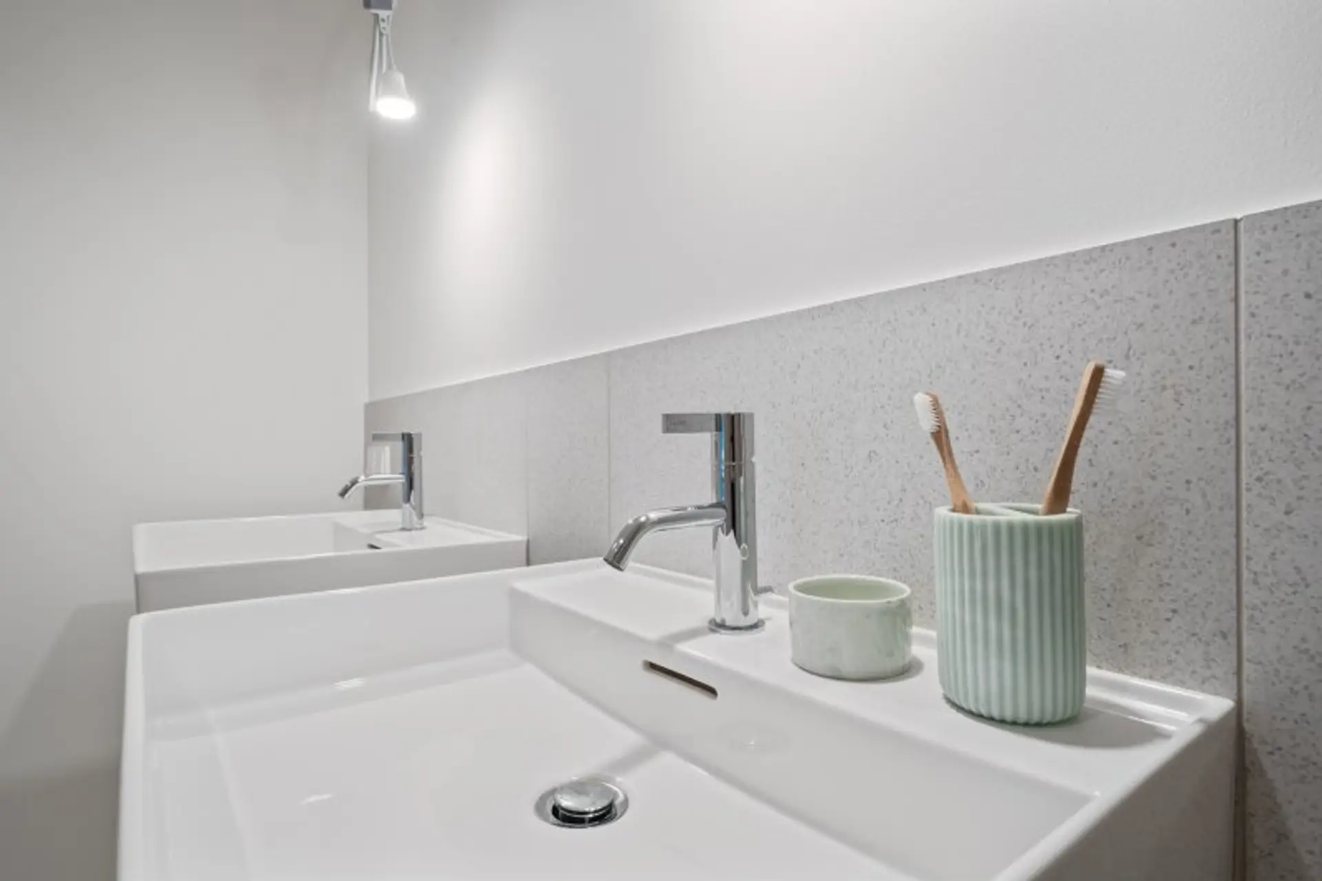* hochwertiges Feinsteinzeug und Sanitärausstattung