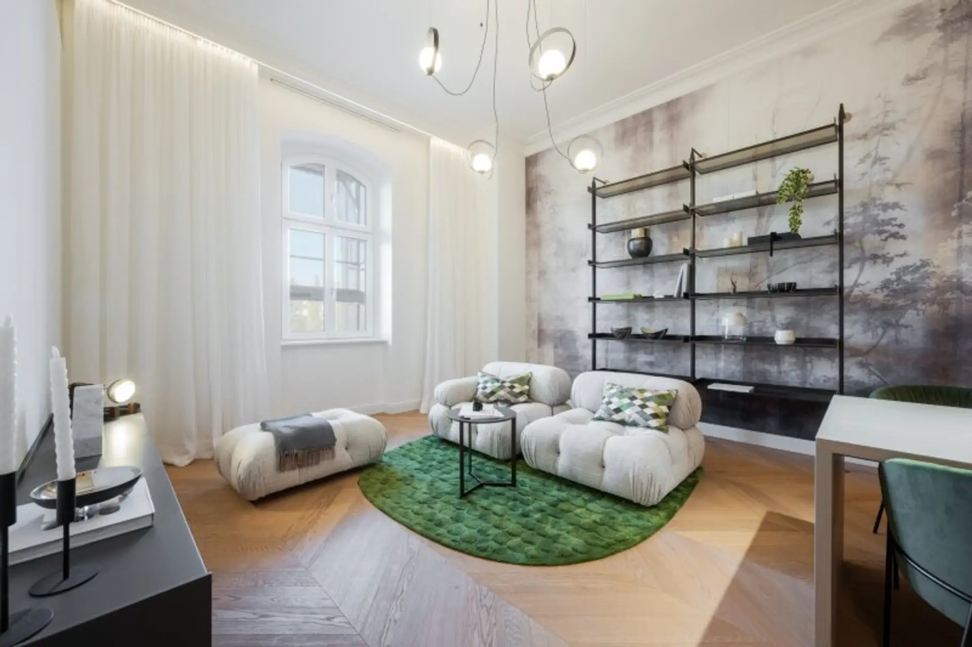 * The units located in the old building impress with their airy room heights, large-format herringbone parquet flooring, elegant baseboards, and wonderful ceiling stucco.