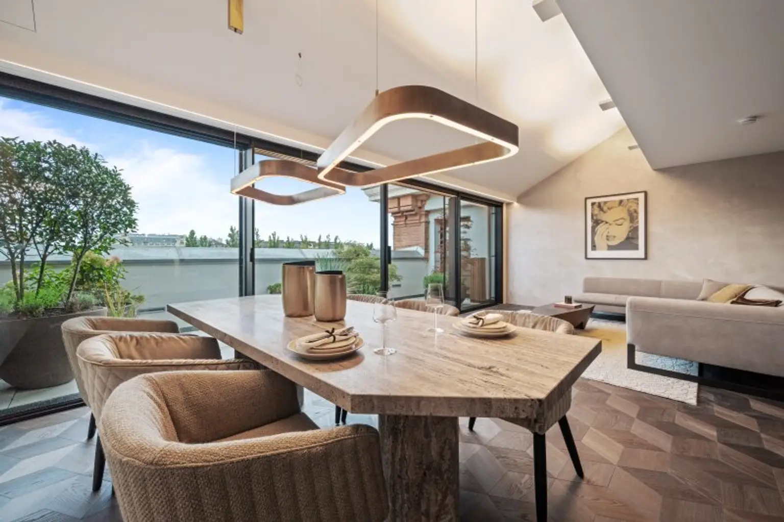 Die Wohnungsgrundrisse im Dachgeschoss eigenen sich für Singles ebenso wie für Familien. Nebst der hochwertigen Ausstattung genießen die zukünftigen Bewohner:innen in den meisten Fällen wunderbare Terrassen mit einem traumhaften Blick Richtung Donaukanal und Innenstadt.