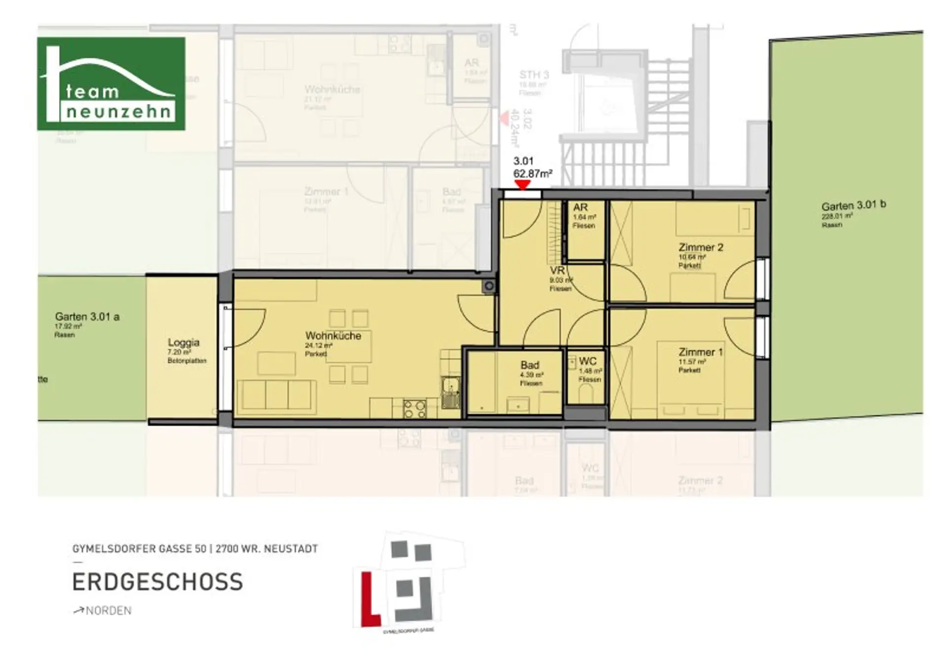 Die 3-Zimmer-Wohnung mit ca. 62,87 m² befindet sich im Erdgeschoss und verfügt über folgende Raumaufteilung: