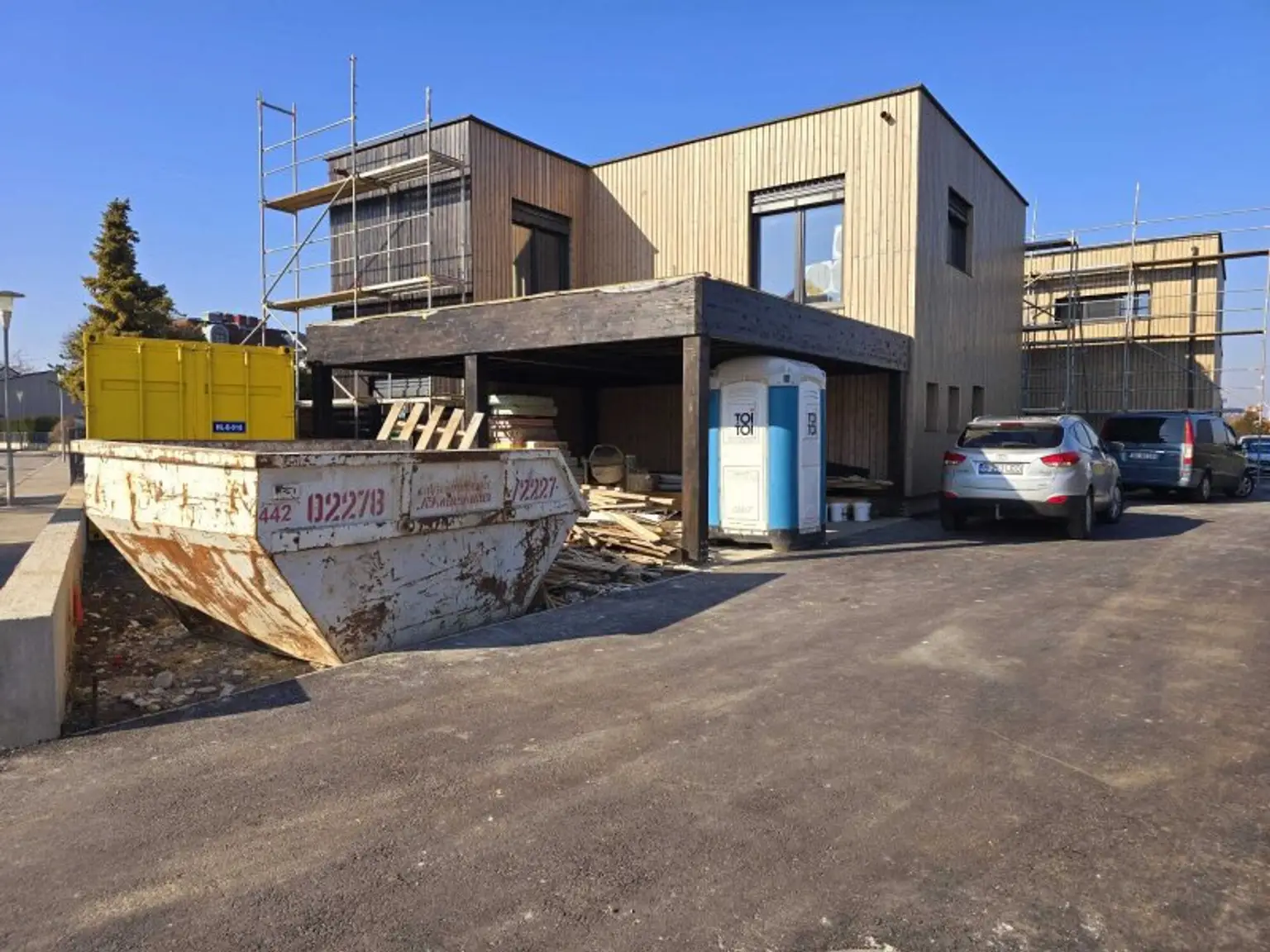 Die Luftwärmepumpe trägt nicht nur zur Nachhaltigkeit bei, sondern auch zu einer effizienten Energienutzung. Der außenliegende Sonnenschutz sorgt dafür, dass Sie auch an heißen Sommertagen eine angenehme Kühle in Ihrem Zuhause genießen können. Das moderne Flachdach und die Verwendung von Holz geben dem Haus eine zeitgemäße und natürliche Ausstrahlung, die harmonisch in die Umgebung integriert ist.