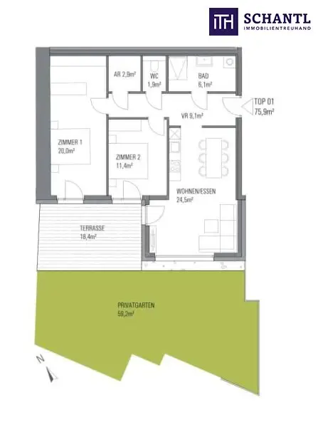 3-Zimmer-Gartenwohnung mit 75,9 m² Wohnfläche