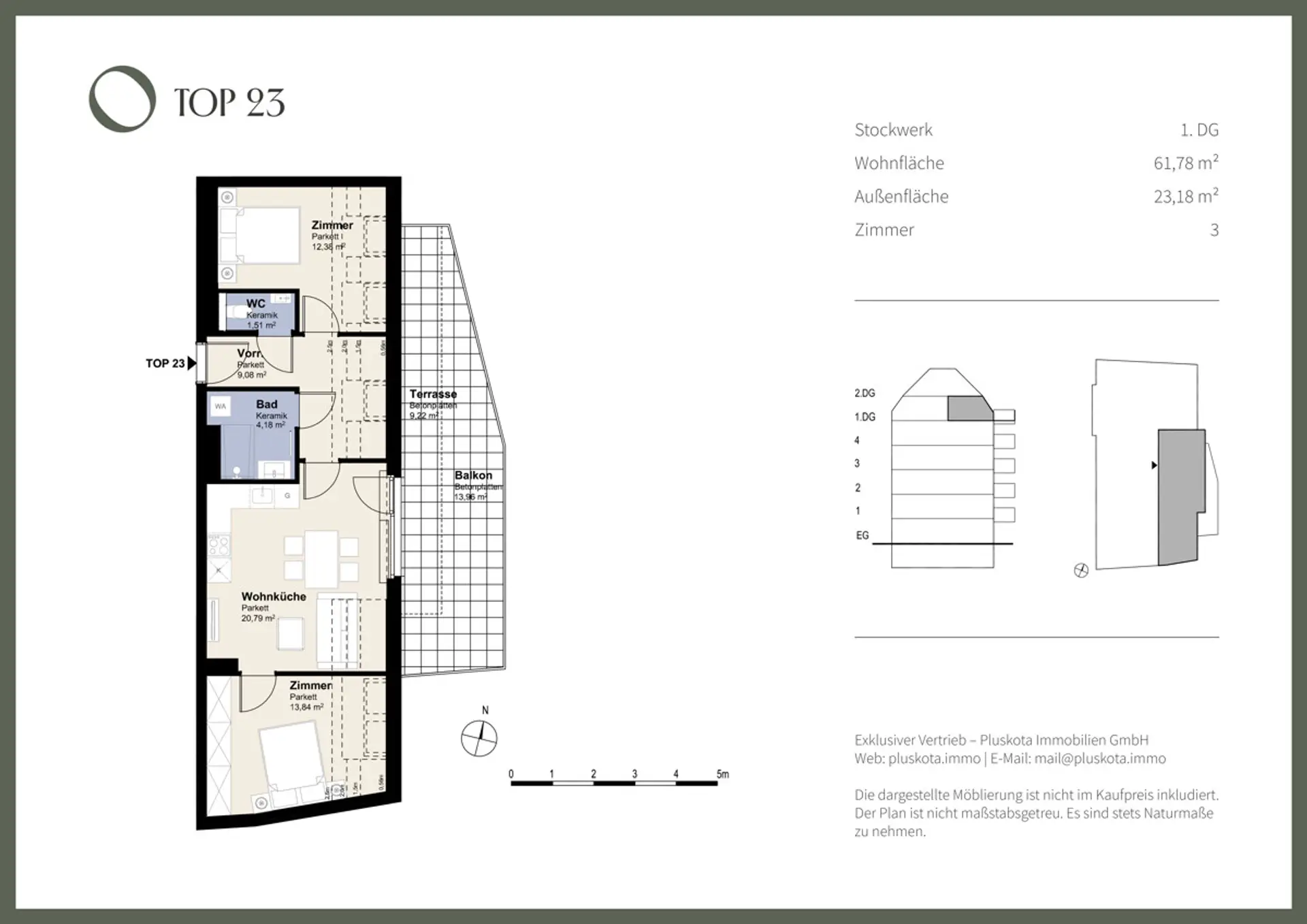 TOP23: Die großzügige 3 Zimmer Wohnung im 1. DG bietet rund 62 m² Wohnfläche und überzeugt durch eine klar strukturierte Raumaufteilung. Die östliche Ausrichtung sorgt vor allem in den Vormittagsstunden für ein helles und angenehmes Wohnambiente. Über das Vorzimmer gelangt man in die Wohnküche mit 20,79 m², die direkten Zugang zu den großzügigen ostseitigen Außenflächen mit insgesamt rund 23 m² bietet. Das 12,38 m² große Schlafzimmer ist vom Vorzimmer aus begehbar, während das zweite Zimmer mit 13,84 m² direkt an die Wohnküche anschließt. Das Badezimmer mit Dusche ist zentral über das Vorzimmer zugänglich, ein separates WC rundet den Grundriss ab. Ideal für Paare, Familien oder Anleger.