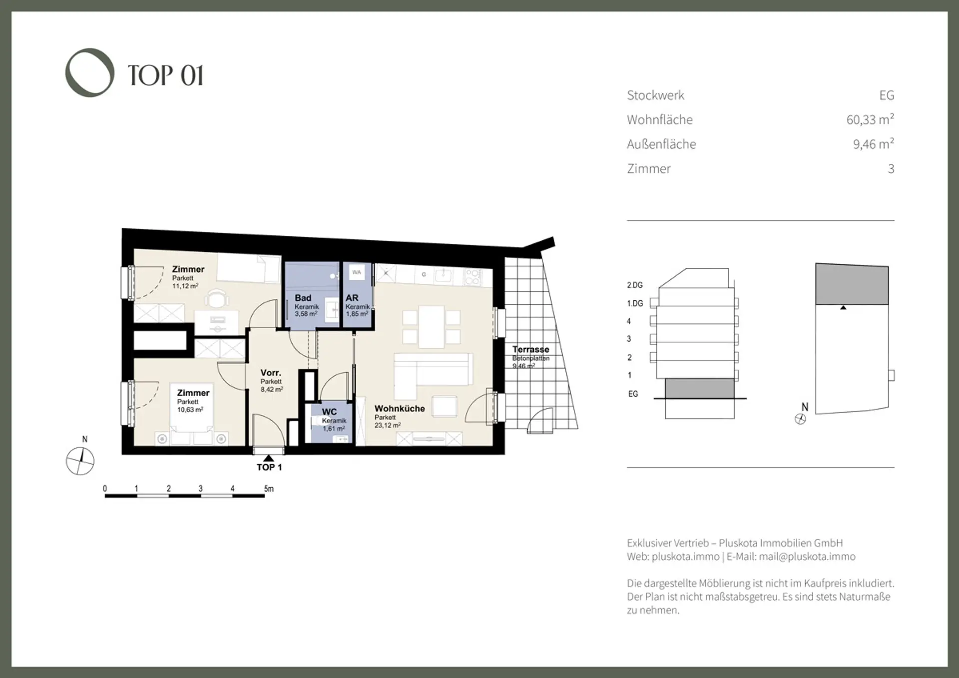 TOP1: Die helle 3-Zimmer-Wohnung im Erdgeschoss überzeugt mit 60,33 m² Wohnfläche und einer optimalen, zentralen Raumaufteilung. Die östlich ausgerichtete Fensterflächen im Wohnzimmer sorgen für viel Tageslicht und ein angenehmes Wohngefühl. Ein besonderes Highlight ist die 9,46 m² große Terrasse mit anschließendem Gartenbereich, die direkt vom Wohnbereich aus begehbar ist und zusätzlichen Freiraum bietet.