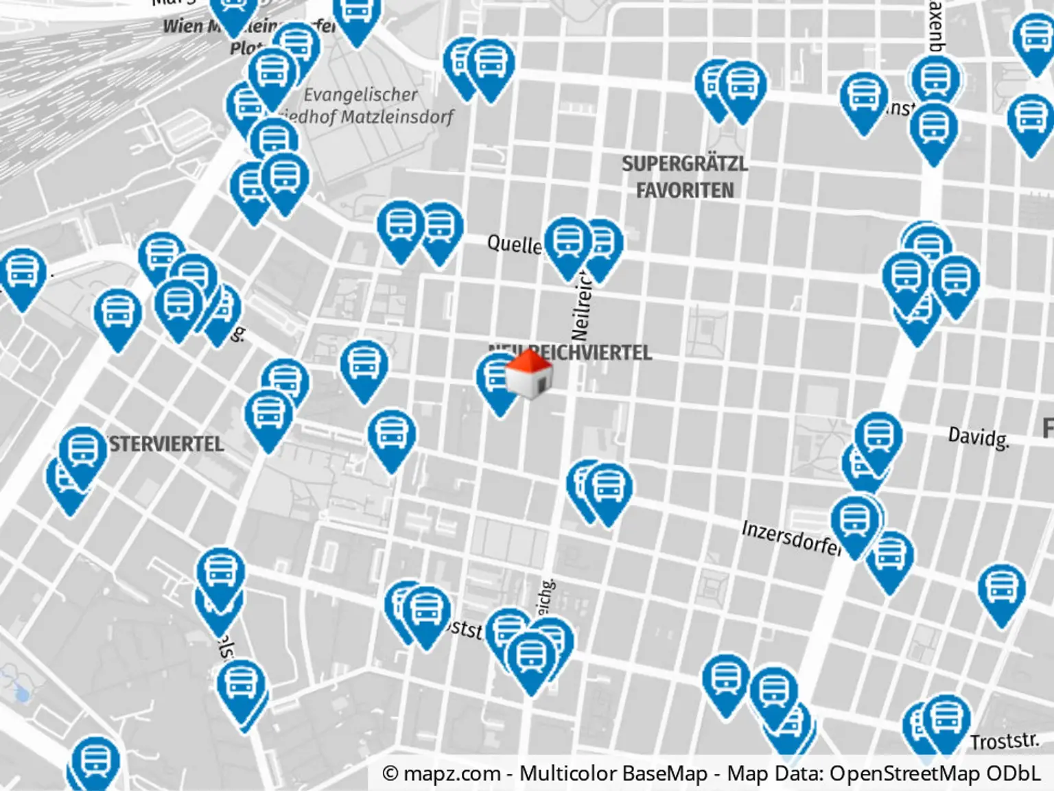 Die Nähe zu wichtigen Verkehrsknotenpunkten wie dem Matzleinsdorfer Platz, dem Hauptbahnhof und dem Reumannplatz macht das Wohnbauprojekt in der Davidgasse in Favoriten nicht nur gut erreichbar, sondern auch zu einem zentralen Punkt in der Stadt.