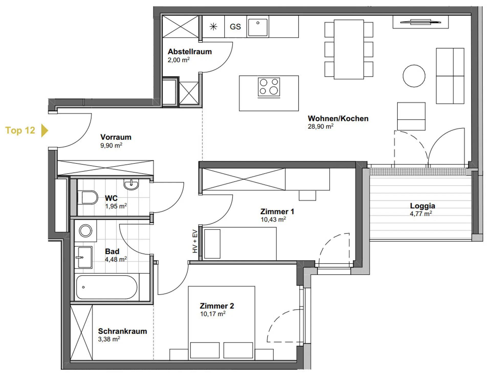 Herzstück ist die großzügige Wohn-Essküche mit Kochinsel – perfekt für alle Hobbyköche. Der offene Wohnbereich bietet viel Platz für Familie und Freunde und führt direkt auf die sonnige Loggia, die dank der ruhigen Innenhoflage zur idealen Stadtoase wird. Zwei zentral begehbare (Schlaf-)Zimmer mit jeweils rund 10 m² bieten vielseitige Nutzungsmöglichkeiten. Eines davon verfügt zusätzlich über einen 3,5 m² großen Schrankraum. Das Badezimmer ist mit hochwertigen Feinsteinzeug-Fliesen, einer Badewanne und einem Waschmaschinenanschluss ausgestattet. Eine separate Toilette sowie ein praktischer Abstellraum sorgen für zusätzlichen Komfort und Stauraum.