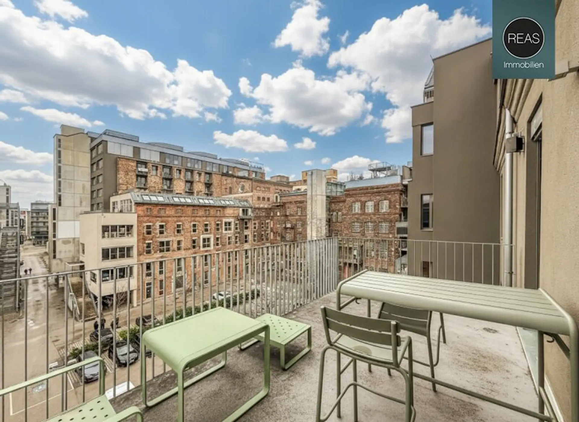 * 1 Balkon direkt angrenzend mit herrlichem Blick auf die Bachsteingebäude der Brotfabrik Wien