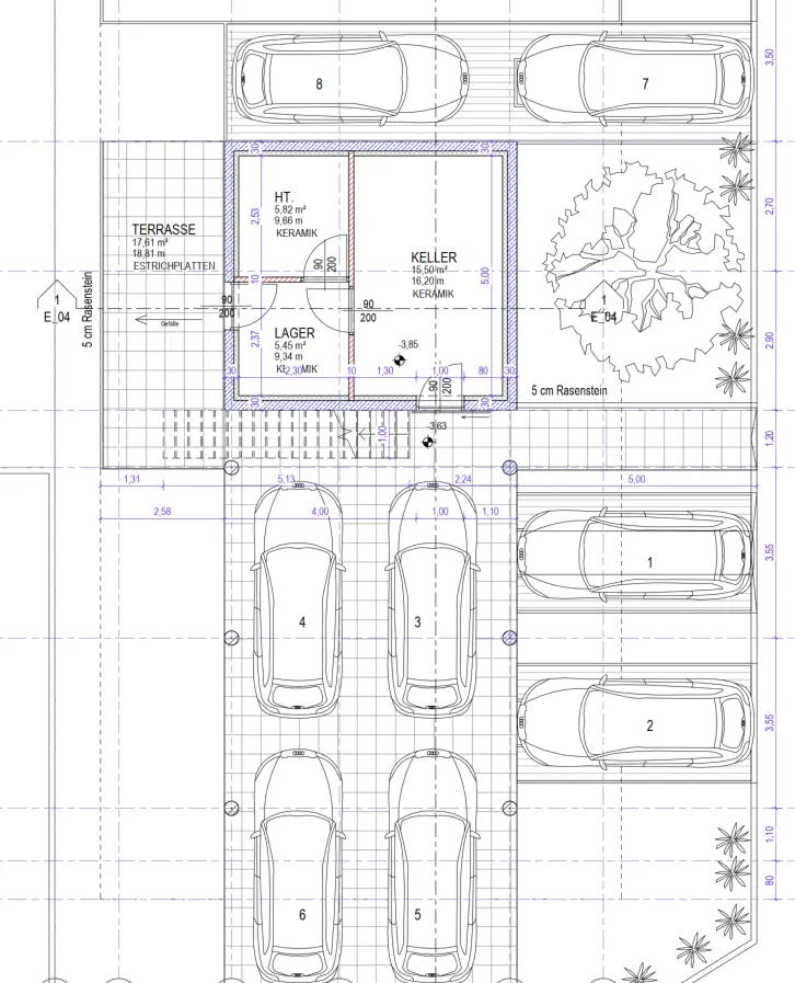 + 8 PKW-Abstellplätzen (3 Kolonnenparkplätze und 2 Einzelparkplätze)