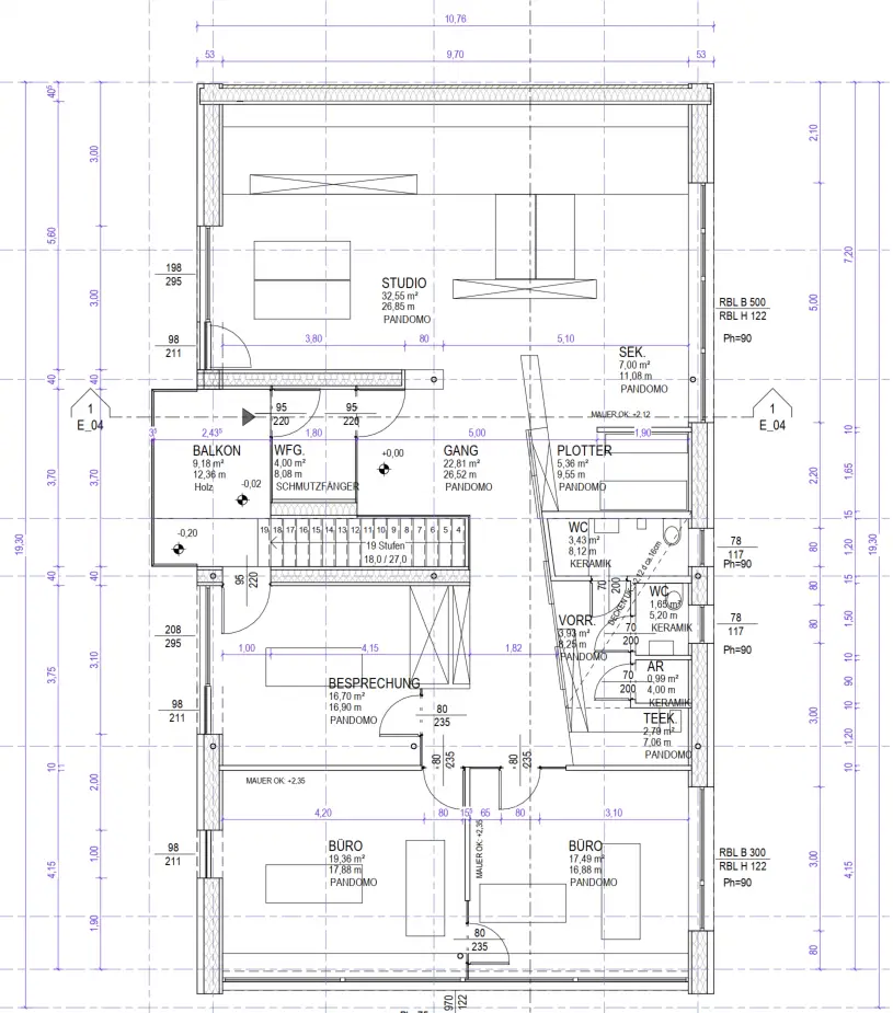 + drei zusätzlichen Büros mit 16-19 m²