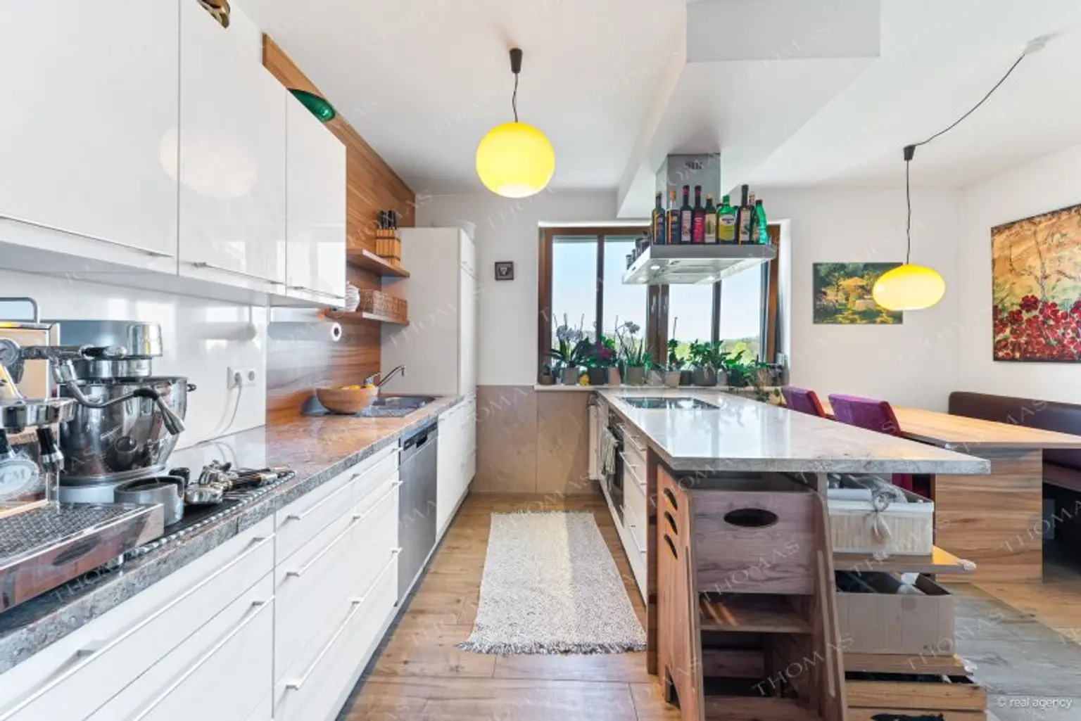 The high-quality fitted kitchen with cooking island is seamlessly integrated into the living space and meets the highest standards. The bathroom is equipped with a bathtub, shower, and WC, while a separate guest WC is also available. A practical storage room/pantry provides additional space.