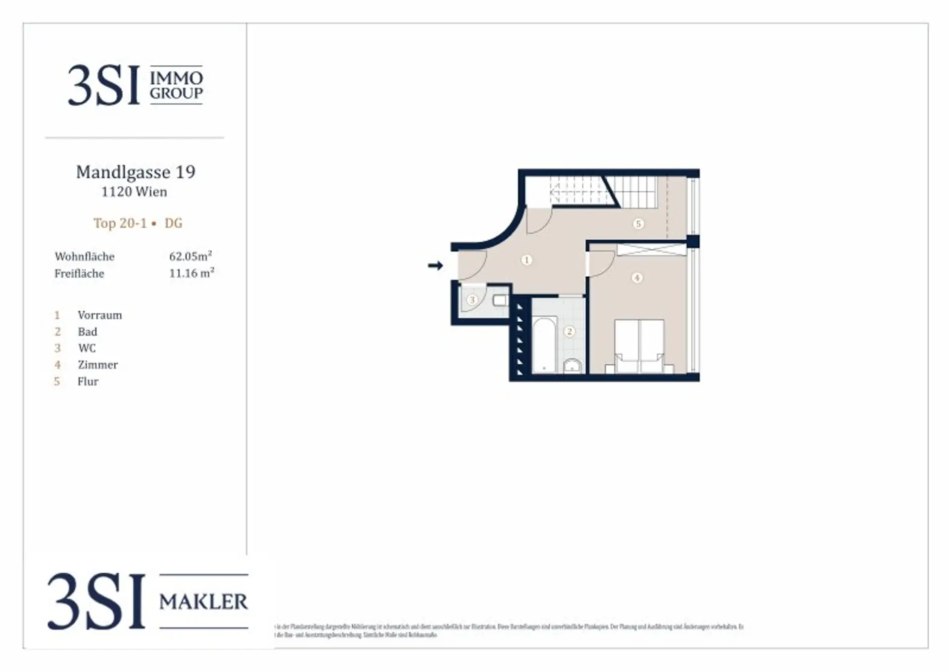 Diese möblierte DG-Maisonette mit 2 Zimmern und einer 11,16 m² großen Terrasse bietet auf rund 62,05 m² Wohnfläche eine und gut durchdachte Raumaufteilung: