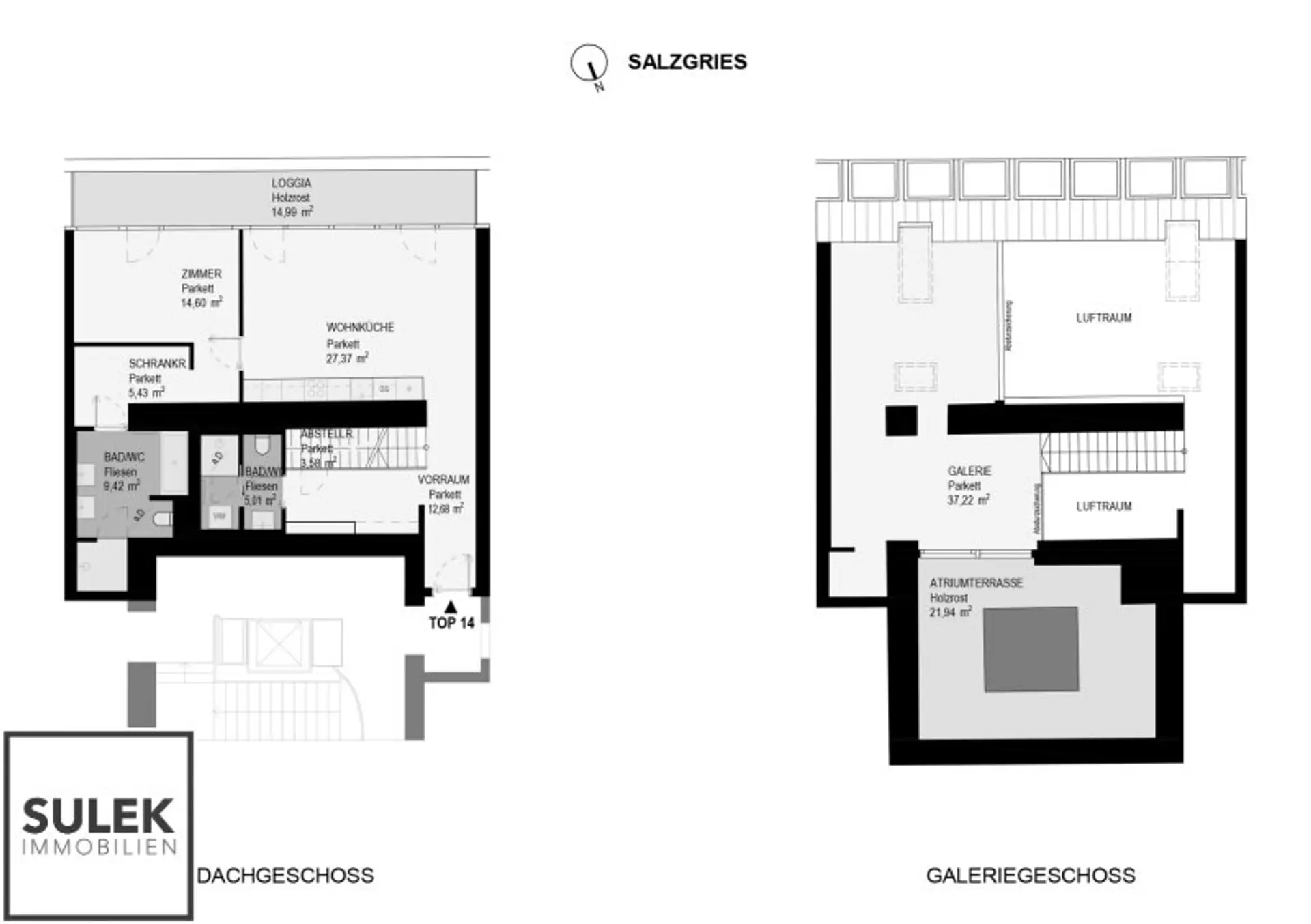 In den oberen Etage, welche über den Vorraum zu erreichen ist, stehen Ihnen rd. 37m² zur Verfügung. Die offene Gestaltung der Galerie lässt viele verschiedene Möglichkeiten der Nutzung zu. Hier befindet sich auch der Ausgang zur rd. 22m² großen Atriumterrasse.