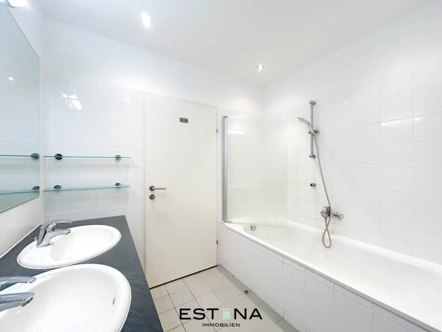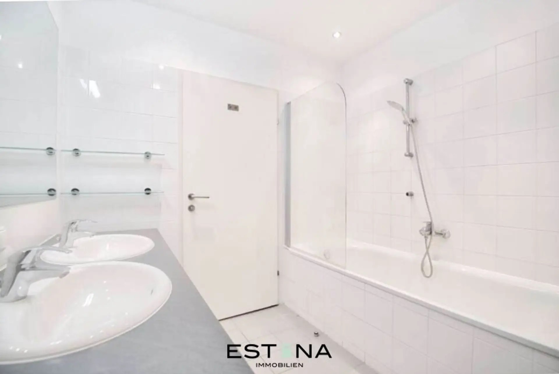- Badezimmer mit Badewanne, Doppelwaschbecken und Waschmaschinenanschluss
