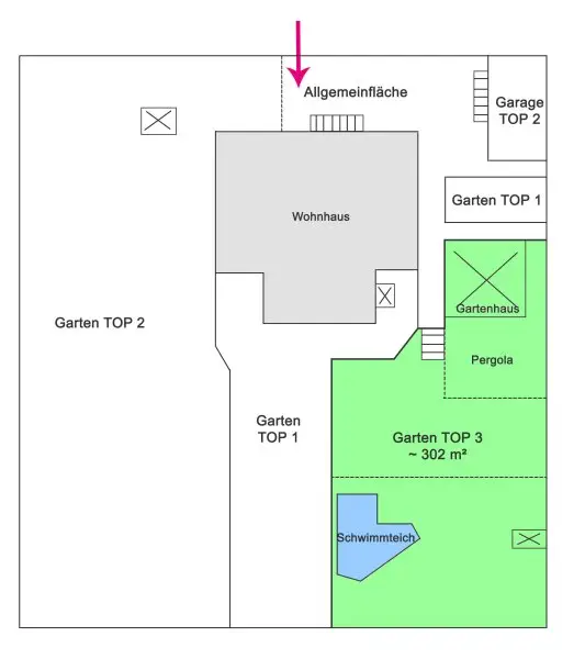 Der südseitige, leicht hanglagige gut 300 m² große Garten ist der Wohnung zugeordnet und ist über die Ostseite des Hauses zugänglich. Hier befindet sich ein ca. 23 m² großes, voll isoliertes Gartenhaus, mit angeschlossener Terrasse mit Pergola sowie ein Schwimmteich mit Natur- und Schwimmbereich.