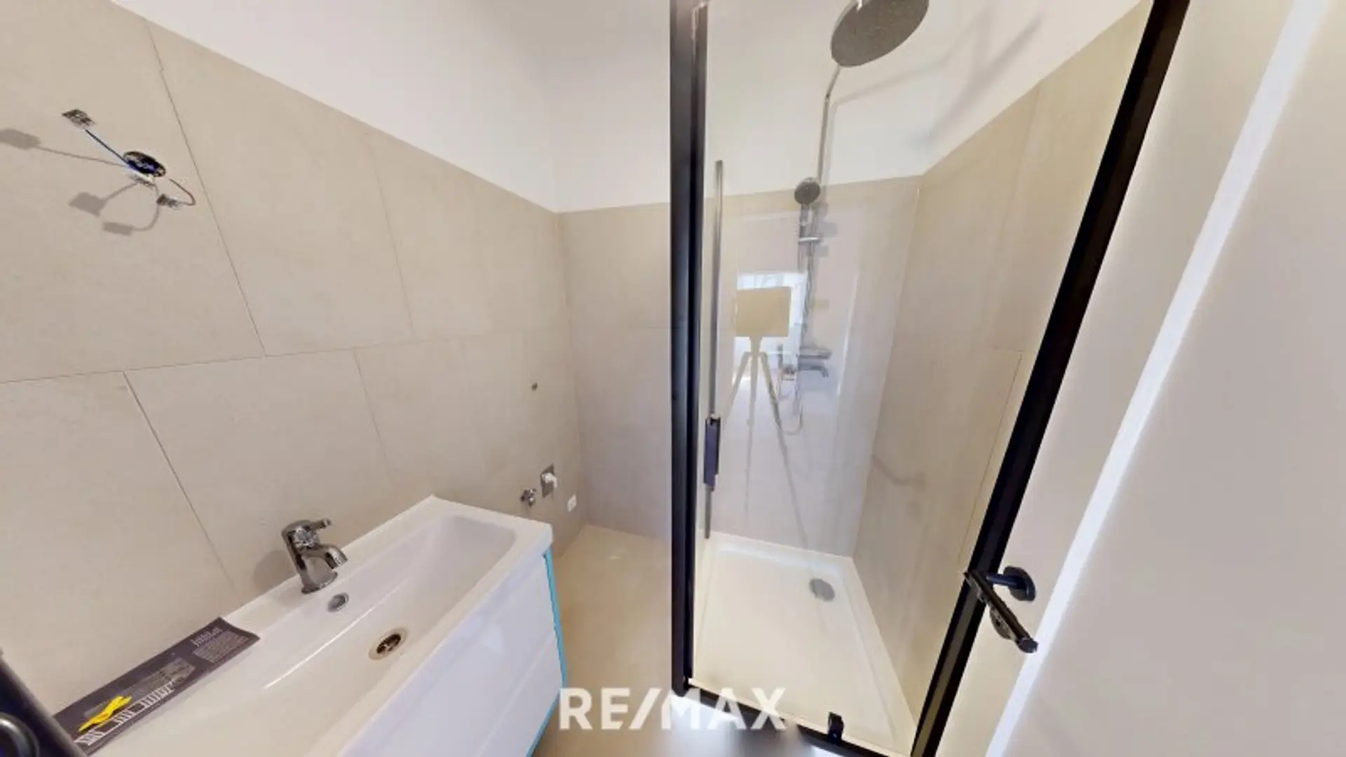 - das Bad mit Dusche und Waschmaschinenanschluss