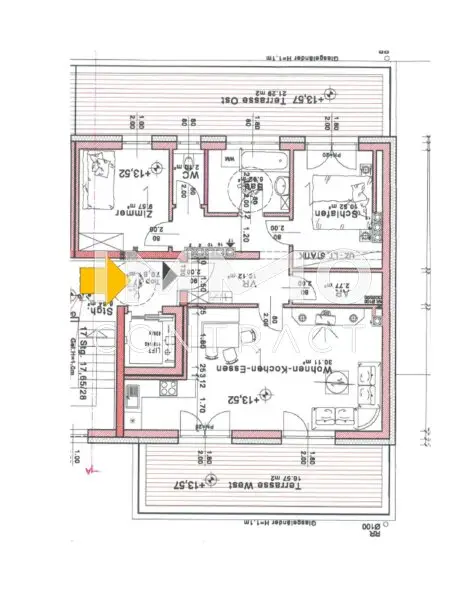 ** Raumaufteilung: Vorraum, Bad, WC, Abstellraum, 2 Schlafzimmer, Wohn-Esszimmer, 2 Dachterrassen,