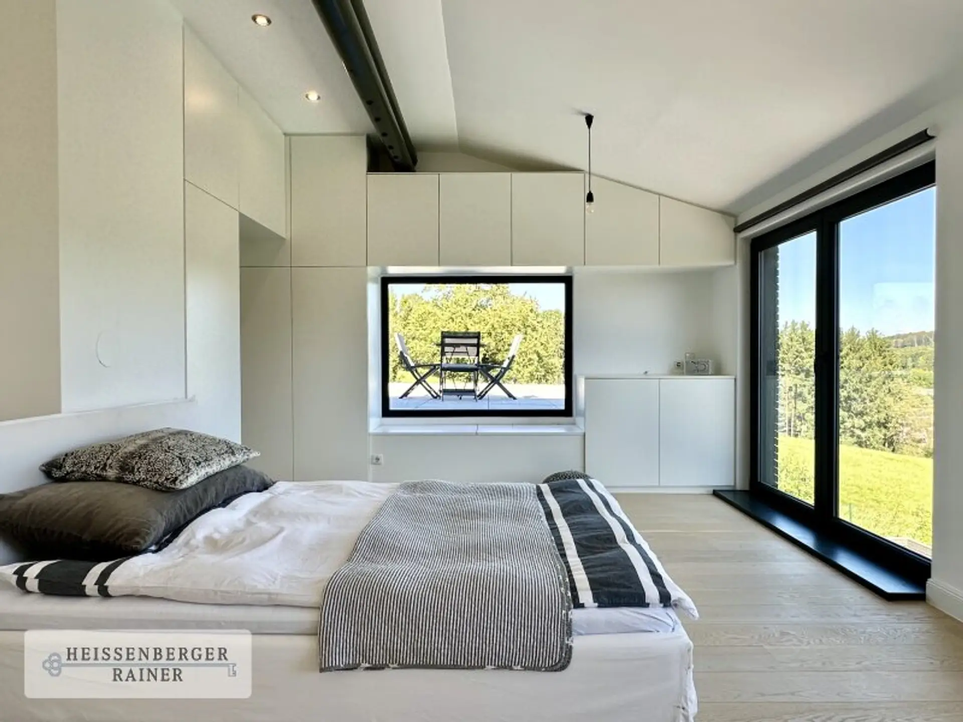 * großes Schlafzimmer mit traumhaftem Panoramablick und großen Fensterflächen