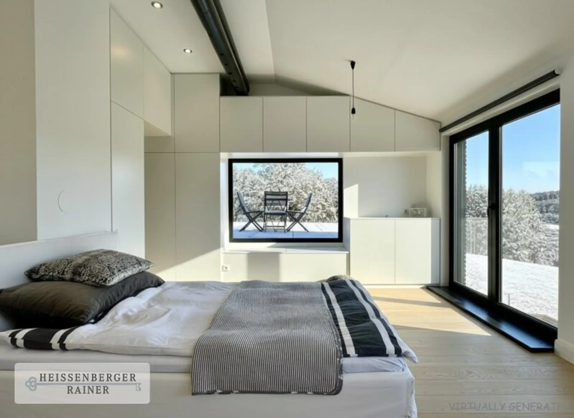 * großes Schlafzimmer mit traumhaftem Panoramablick und großen Fensterflächen