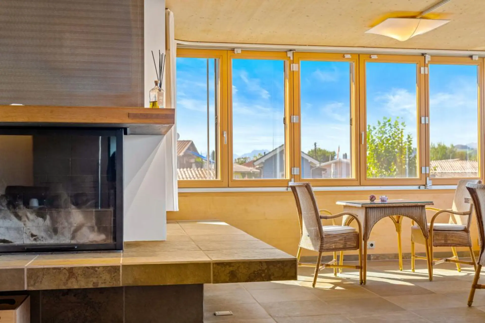 Die großen Fensterfronten im Obergeschoss öffnen die Wohnfläche zum Wasser, geschützt durch eine vorgesetzte Schiebeverglasung, die gleichzeitig Windruhe und perfekten Schutz der Holzfenster bietet. Hier sitzt man selbst bei Sturm entspannt und hört – nichts. Hinter der Glasfront entfaltet sich ein Wohnraum mit offenem Kamin, hochwertiger Gaggenau-Küche und weitläufigem Blick auf den Kanal – immer mit direktem Bezug zur Natur.