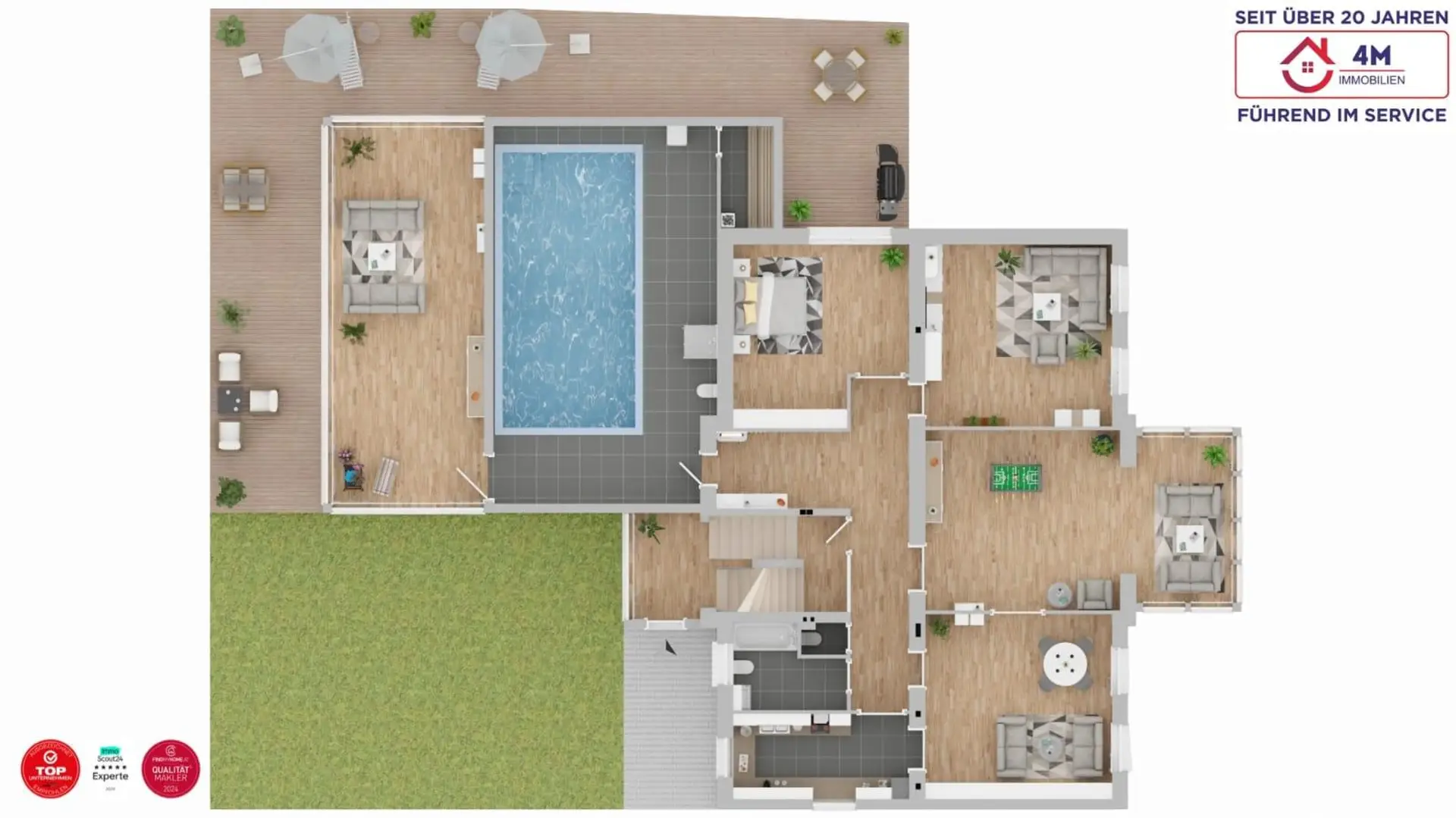 Gartenseitig ergänzt ein großflächiger Wintergarten den Bereich – ideal als Hobbyraum, Atelier oder Rückzugsort.