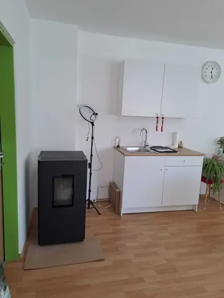 Neue Fenster und neuer Laminatboden, Heizung mit Pelletsofen und elektrisch möglich, Miniküche, WC. Fotos mit Einrichtungsbeispiel.