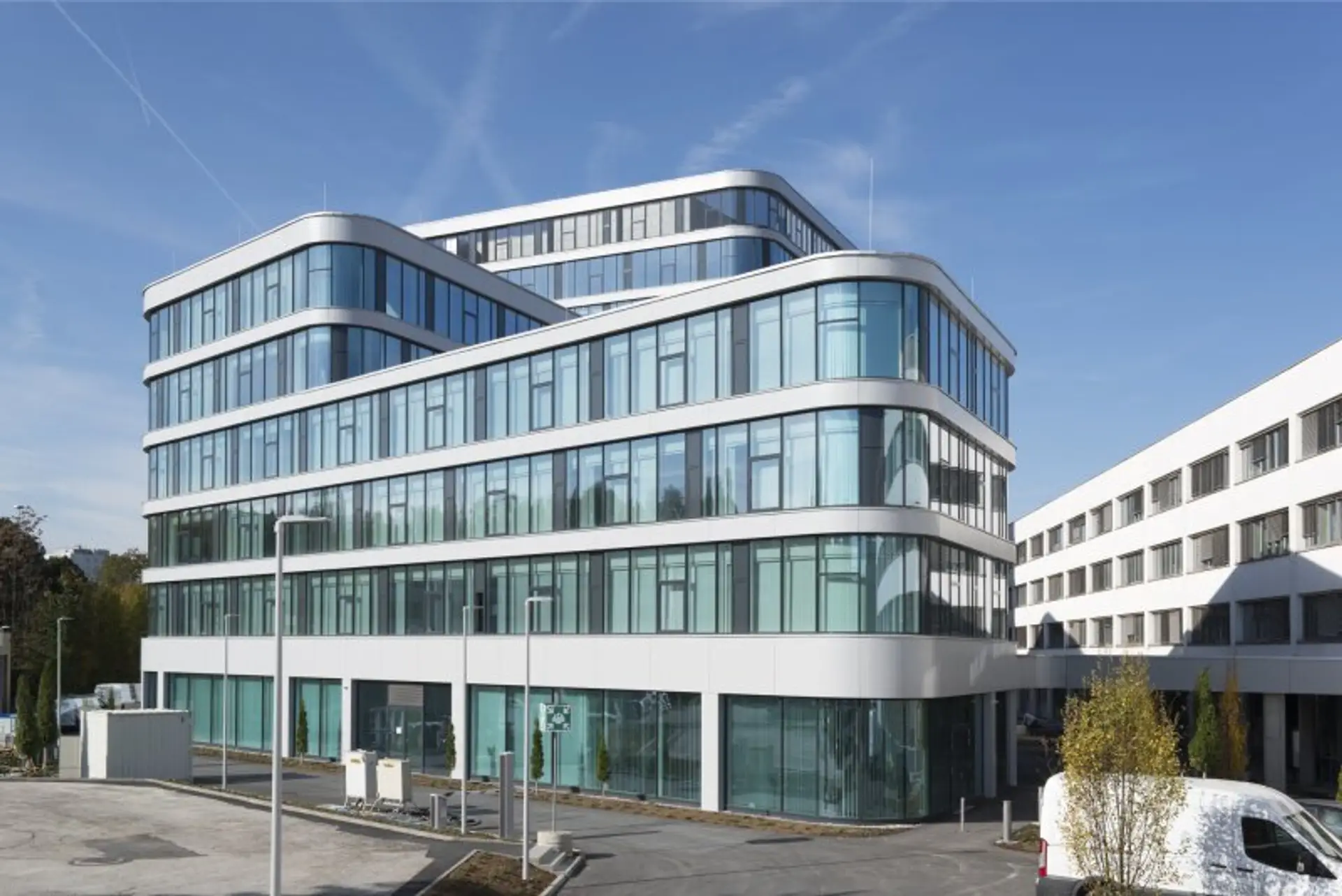 Das Bestandsobjekt ist der Mittelpunkt des Campus, in dem auch die Gastronomie angesiedelt sein wird. Über einen zentralen Haupteingang gelangt man barrierefrei in die Büros.