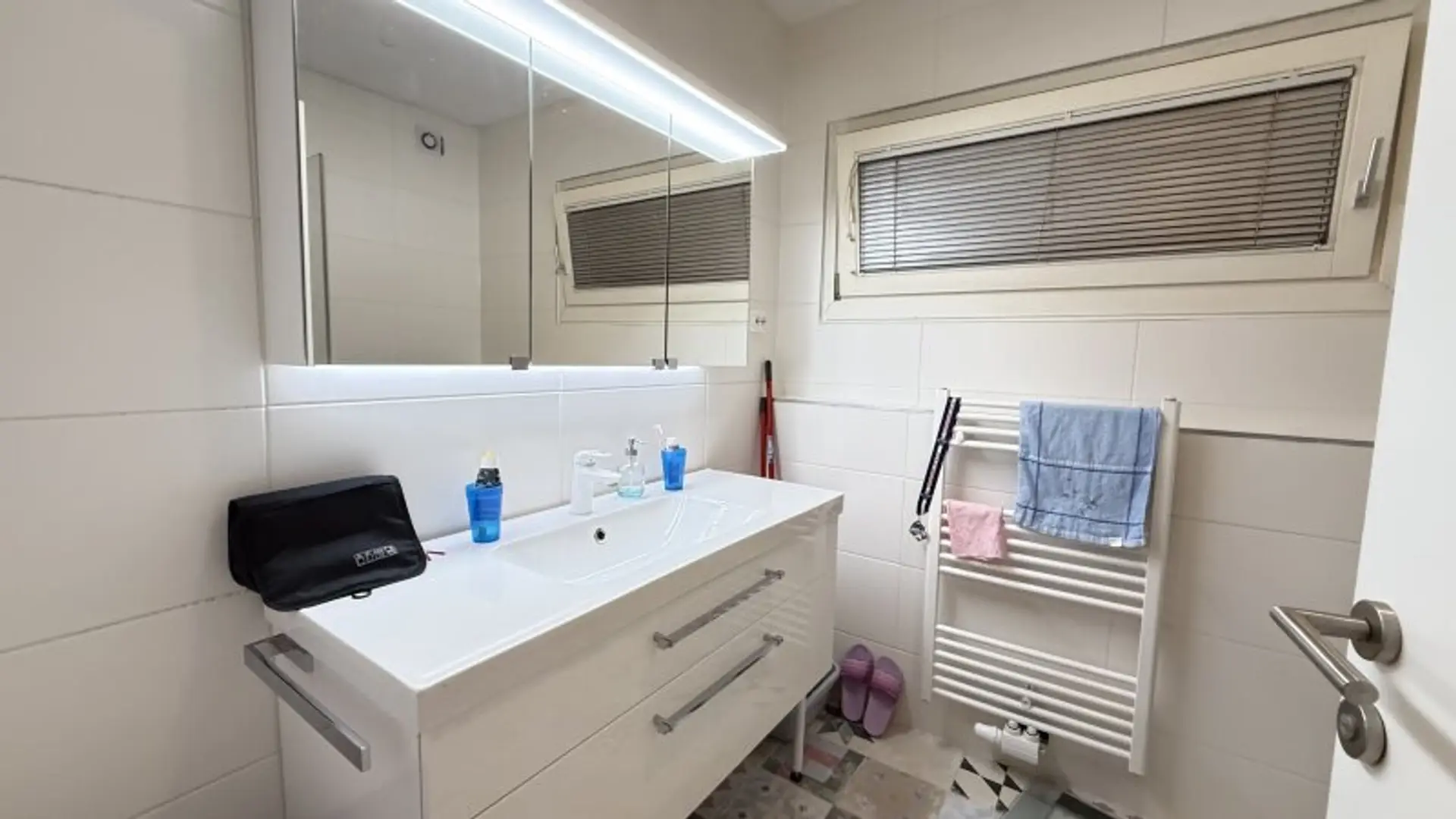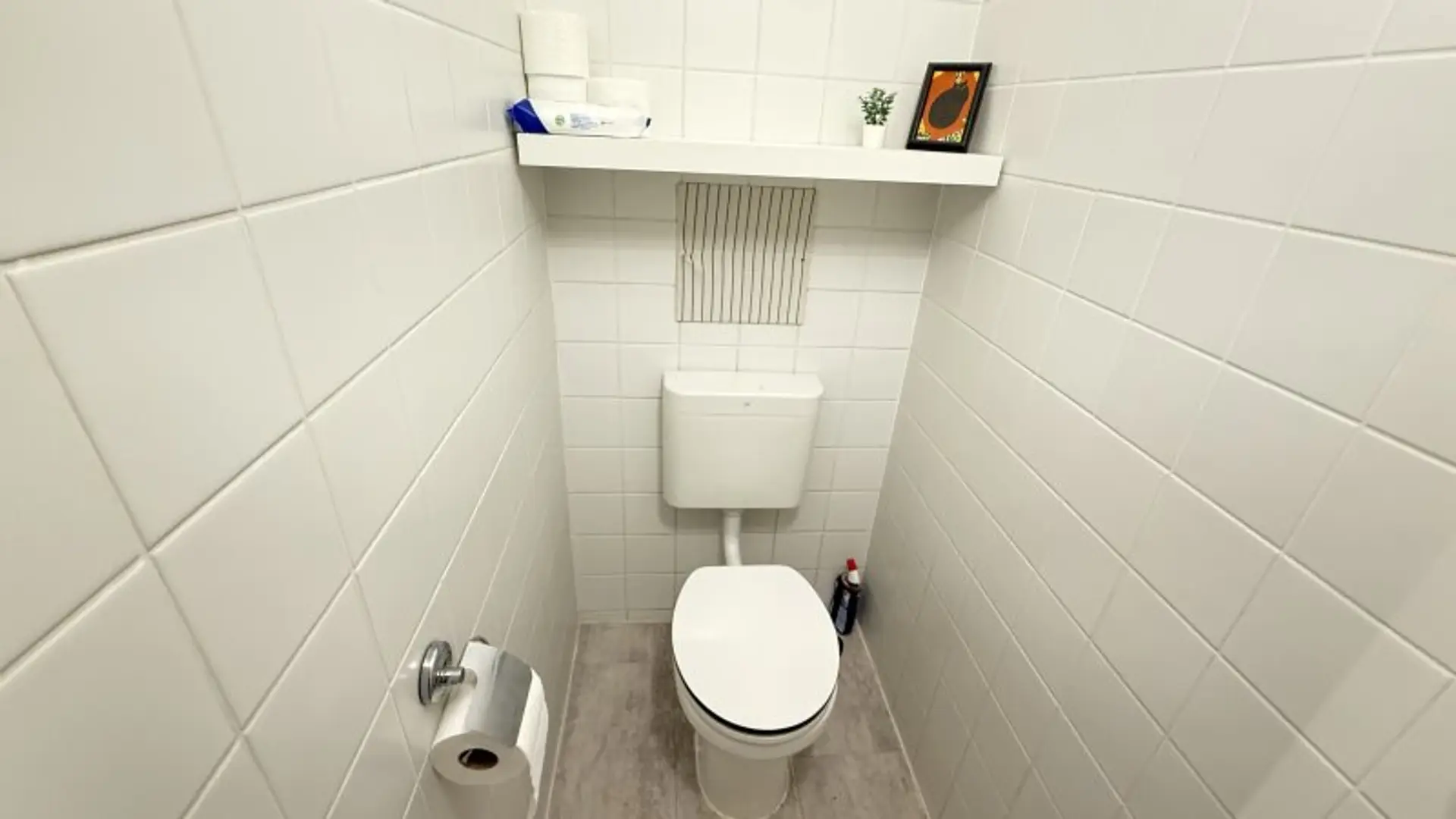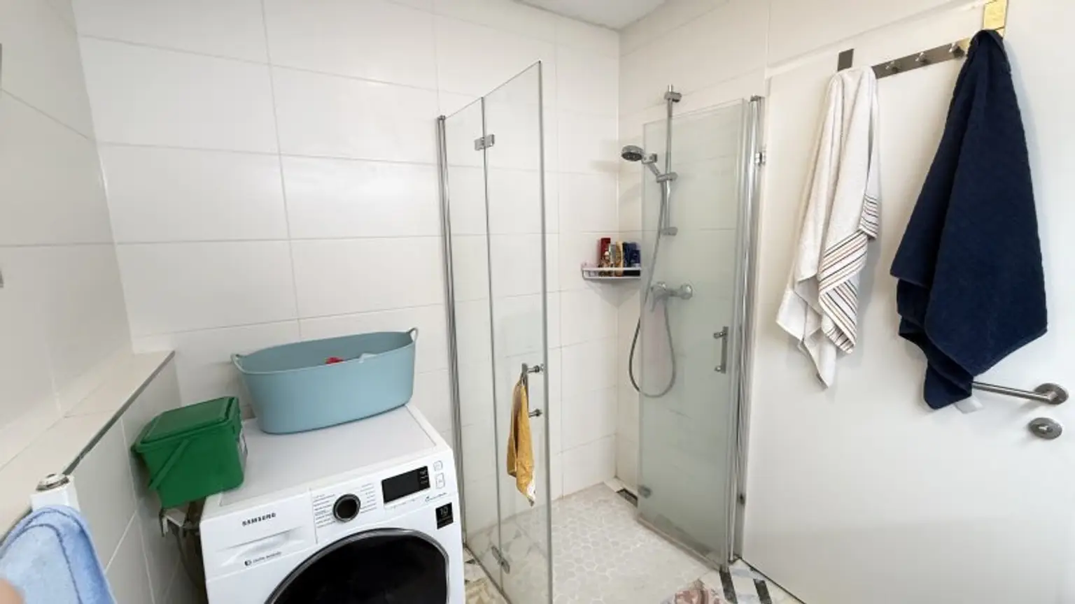 Das Bad ist mit einer Dusche und Waschmaschine ausgestattet. Die Toilette liegt separat nebenan.