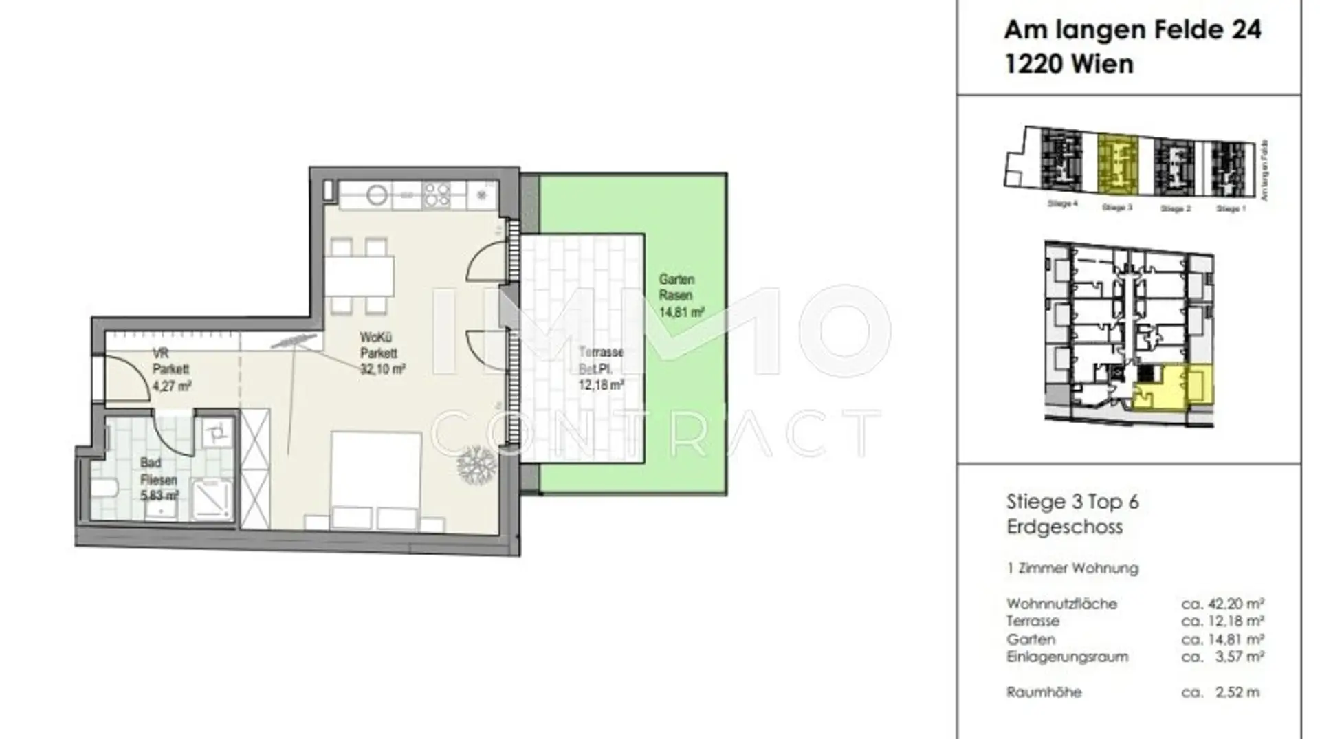 Im 22. Wiener Gemeindebezirk, nahe der U1-Station Kagraner Platz, stehen bereits fertiggestellte Eigentumswohnungen zum Einzug bereit. Die Wohnhausanlage mit vier Stiegen und Tiefgarage überzeugt durch eine erstklassige, energieeffiziente Bauweise mit Fernwärme, Photovoltaikanlage und Fußbodenheizung – ideal für alle, die nachhaltig und zukunftssicher wohnen möchten.