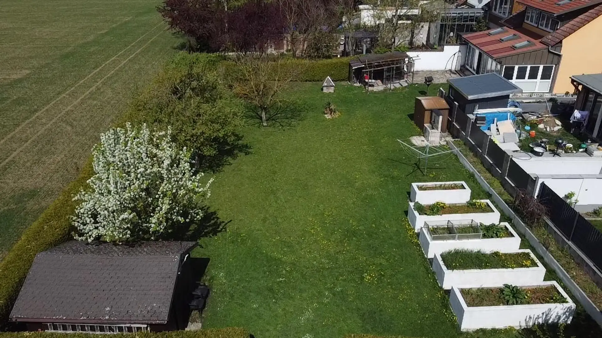 Im Garten wurden 2 Gartenhütten sowie 4 Hochbeete errichtet.