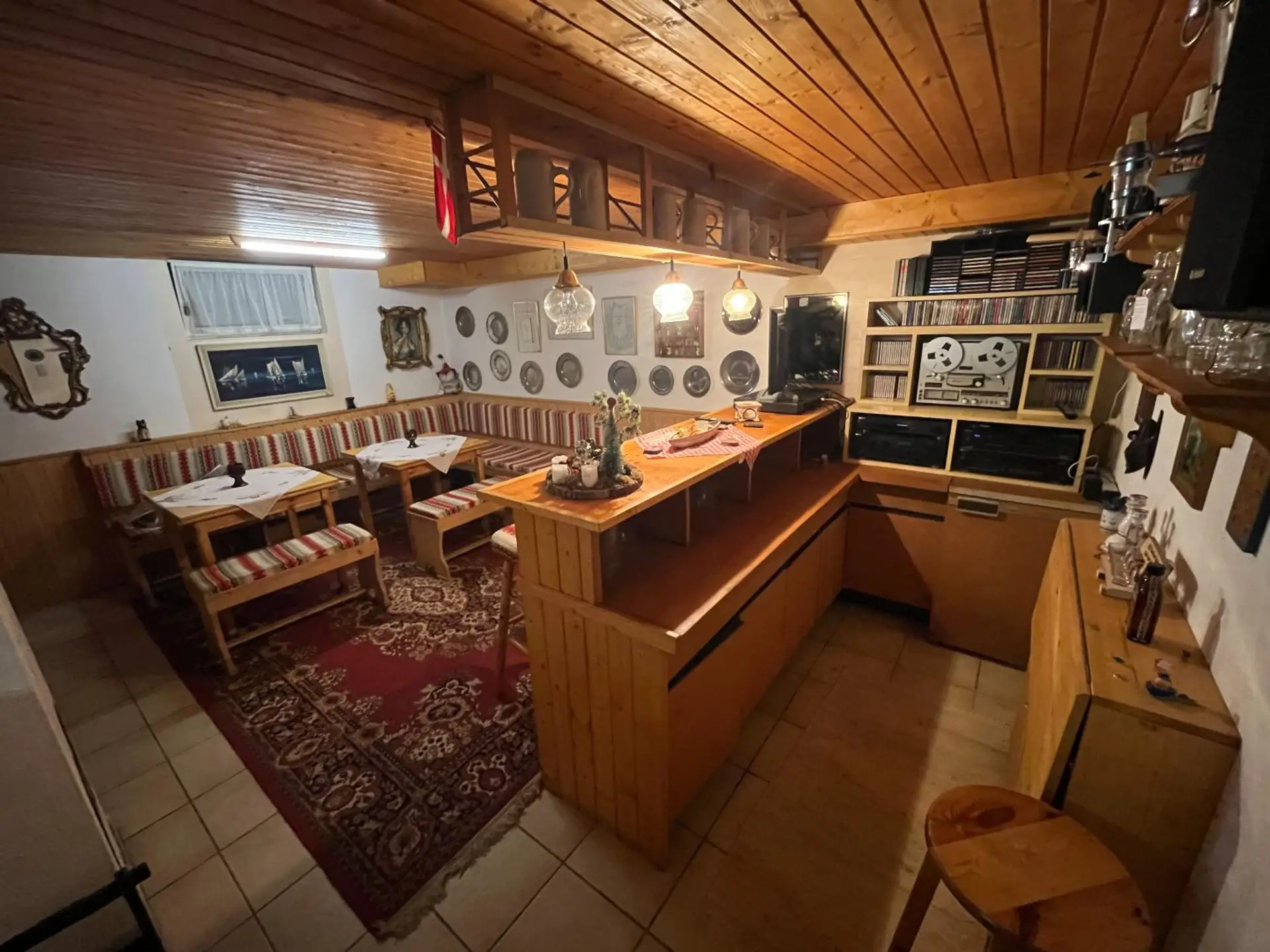Im Keller hat sich der Besitzer einen Partyraum mit eine Kellerbar installiert.