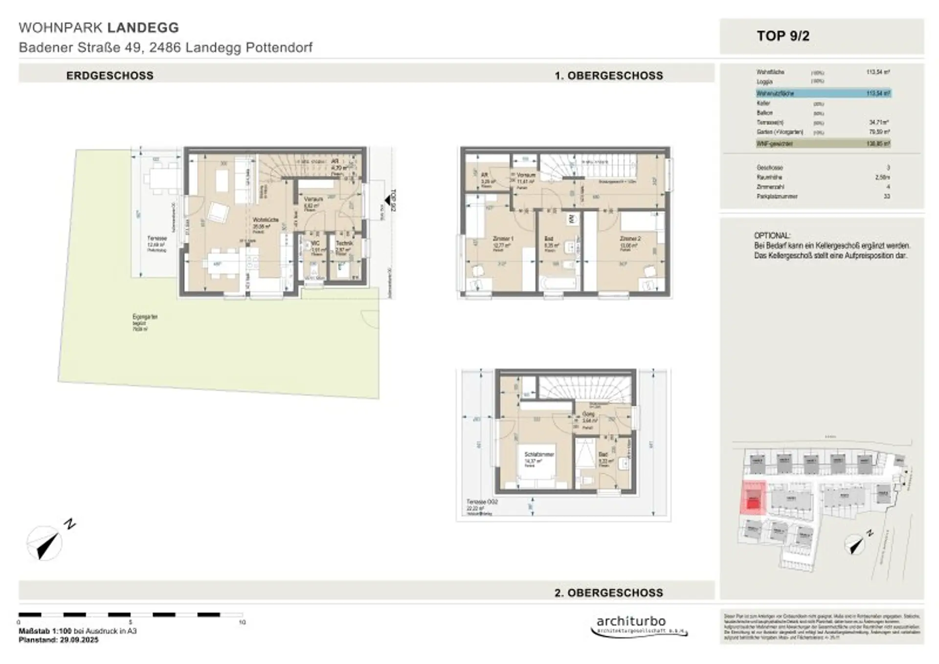 Zur Auswahl stehen 4 verschiedene Haustypen mit zwei bzw. drei Ebenen zwischen 83 m2 und 121 m2. Die zweigeschoßigen Häuser verfügen über 3 Zimmer, die Dreigeschoßigen bieten mit 4 Zimmern etwas mehr Platz. Alle dreigeschoßigen Wohneinheiten haben, zusätzlich zu den großzügigen Terrassen und Eigengärten, auch eine riesige, rundumlaufende Dachterrasse.