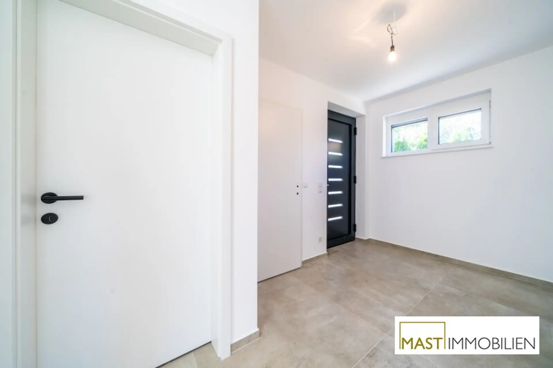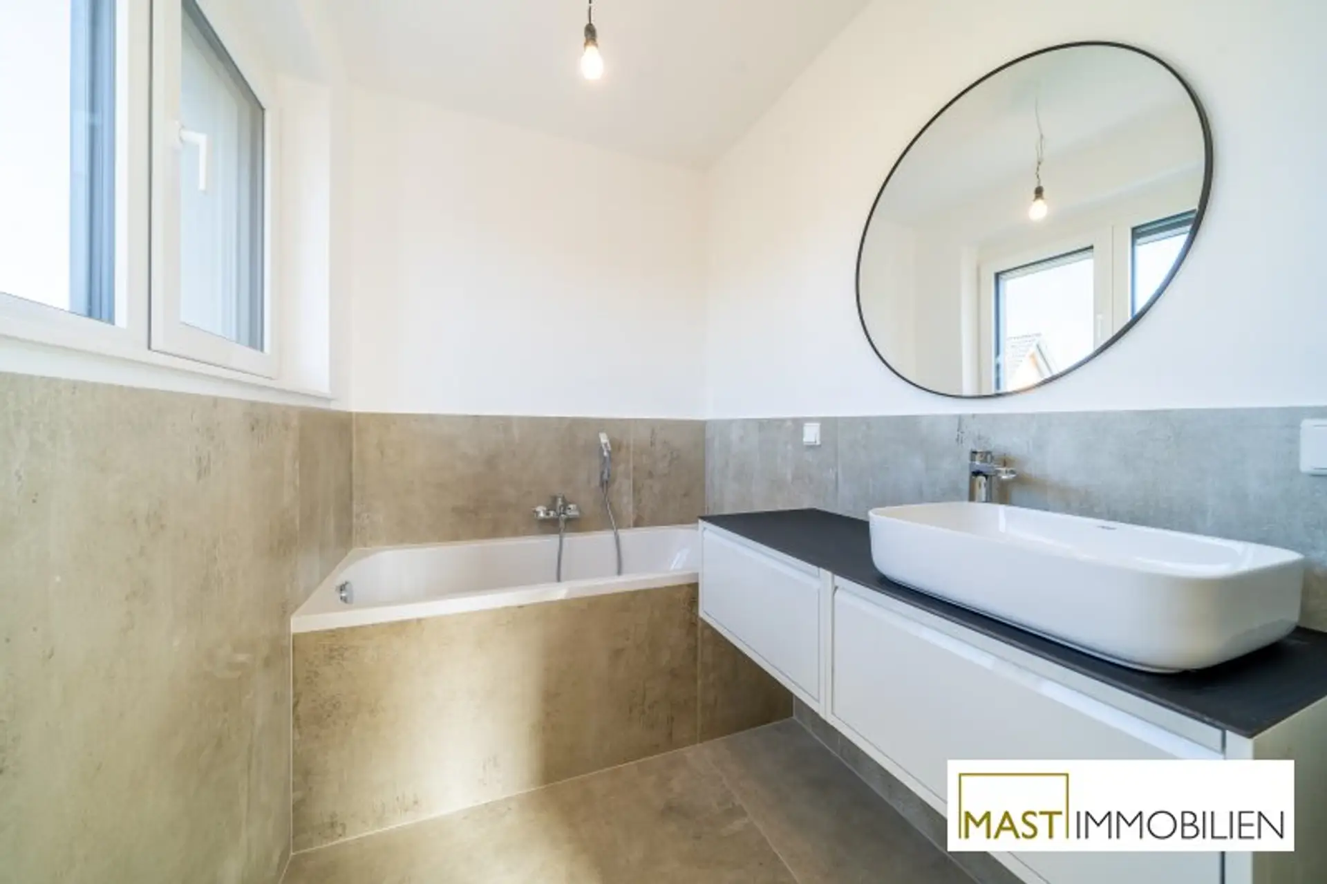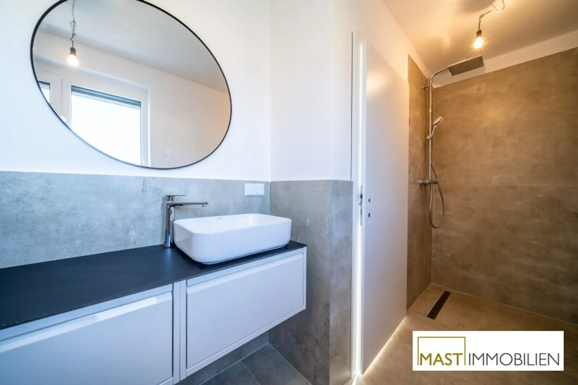 * moderne, großformatige Fliesen in den Sanitärräumen