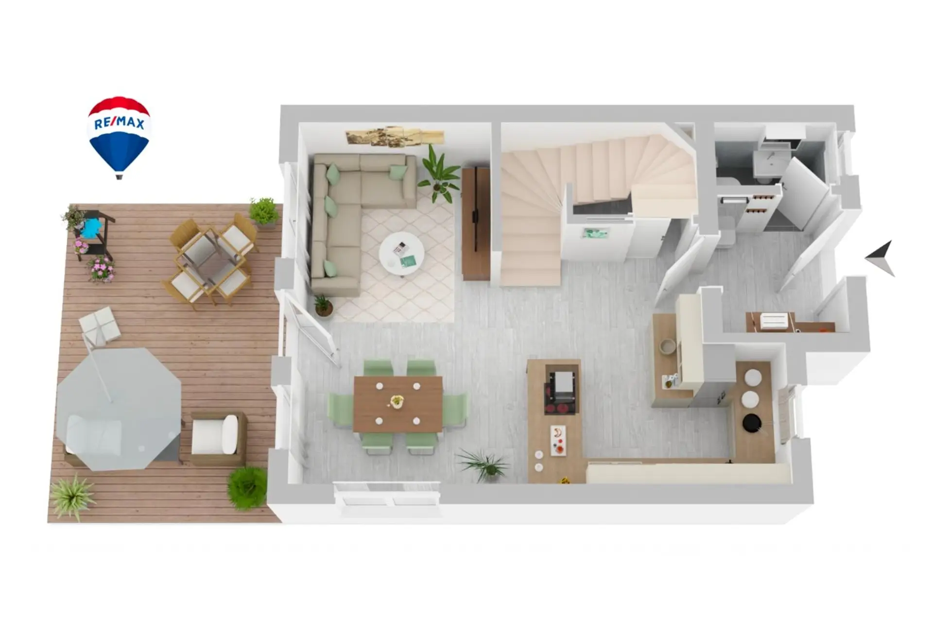 Das Erdgeschoß betritt man durch den Eingangsbereich anknüpfend das WC, der offene Bereich von Ess,- Wohn und Kochzimmer mit einer tollen Speis.