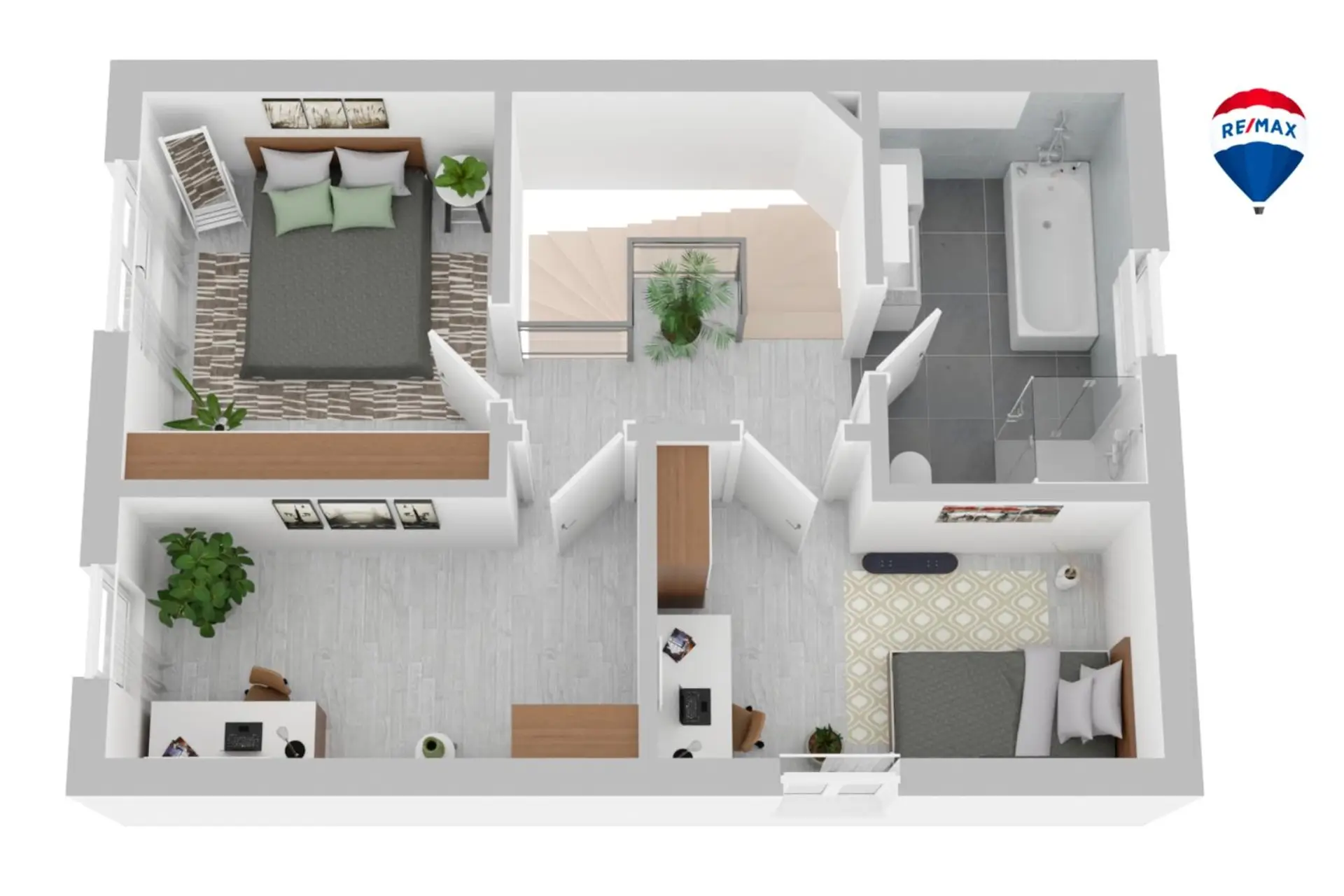 Über die Treppe gelangt man in den Vorraum des Obergeschoßes, wo man zentral die weiteren Räumlichkeiten betreten kann. Das Schlafzimmer, das Bad mit WC und die 2 Zusatzzimmer ergänzen die gute Raumaufteilung.